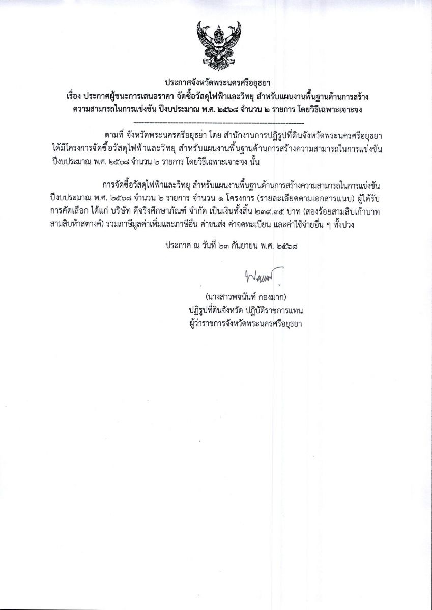 ประกาศผู้ชนะการกสนอราคา จัดซื้อวัสดุไฟฟ้าและวิทยุ สำหรับแผนพื้นฐานด้านการสร้างความสามารถในการแข่งขัน ปีงบประมาณ พ.ศ. 2568 จำนวน 2 รายการ โดยวิธีเฉพาะเจาะจง