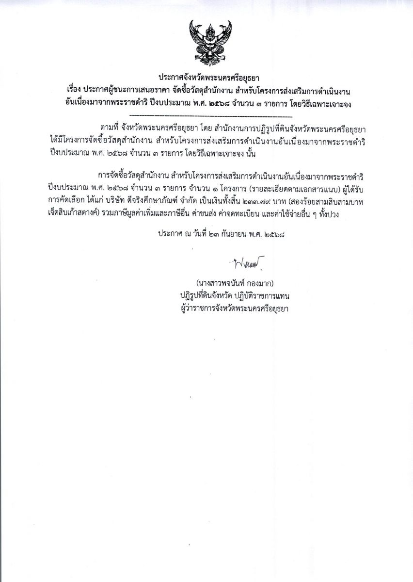 ประกาศผู้ชนะการเสนอราคา จัดซื้อวัสดุสำนักงาน สำหรับโครงการส่งเสริมการดำเนินงานอันเนื่องมาจากพระราชดำริ ปีงบประมาณ พ.ศ. 2568 จำนวน 3 รายการ โดยวิธีเฉพาะเจาะจง