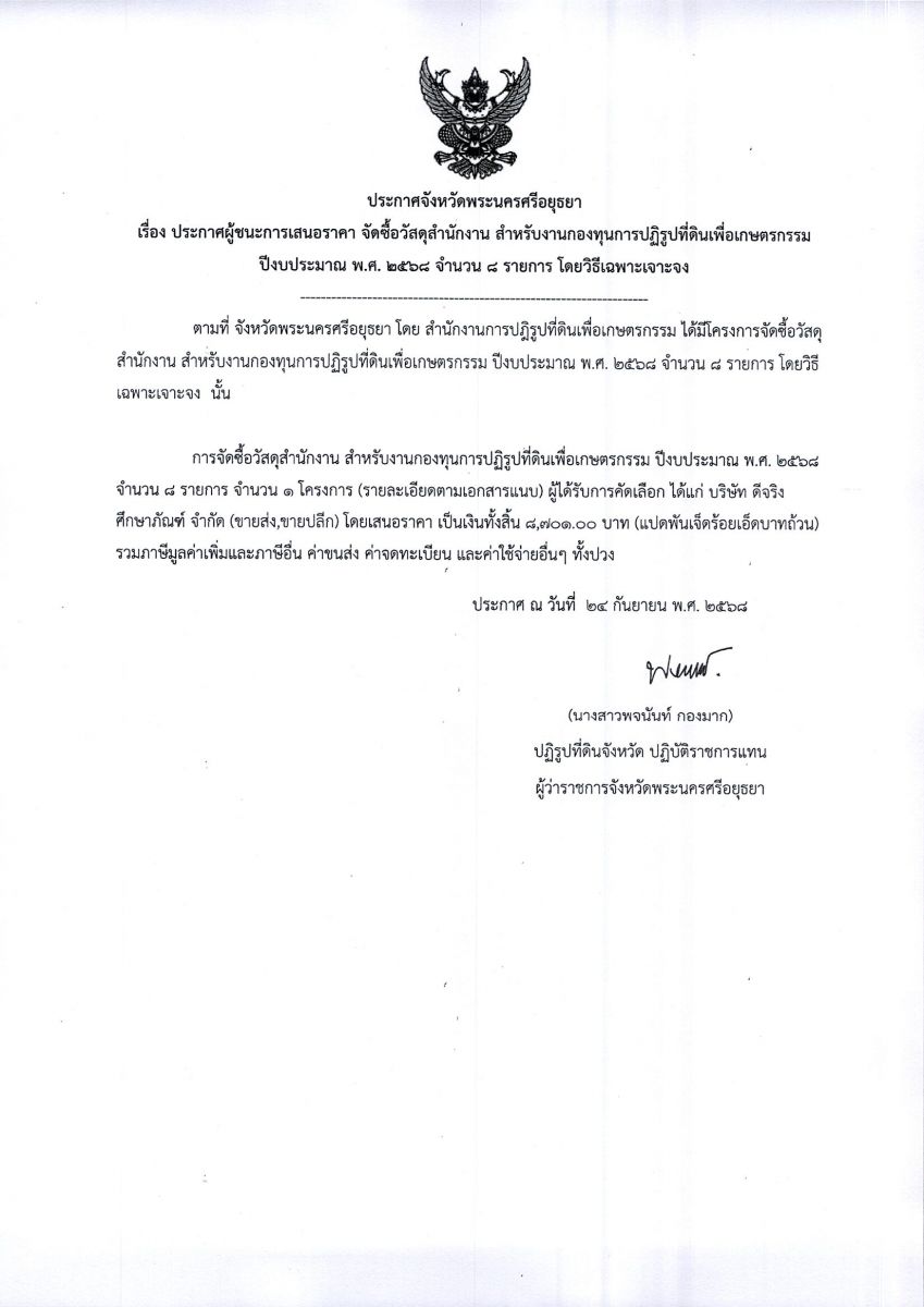 ประกาศผู้ชนะการเสนอราคา จัดซื้อวัสดุสำนักงาน สำหรับงานกองทุนการปฏิรูปที่ดินเพื่อเกษตรกรรม ปีงบประมาณ พ.ศ. 2568 จำนวน 8 รายการ โดยวิธีเฉพาะเจาะจง