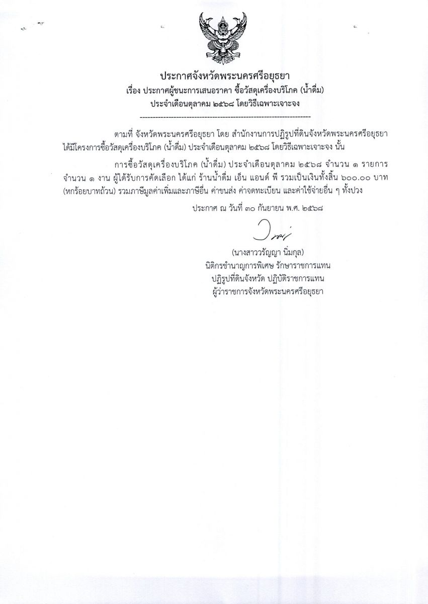 ประกาศผู้ชนะการเสนอราคา ซื้อวัสดุเครื่องบริโภค (น้ำดื่ม) ประจำเดือนตุลาคม 2568 โดยวิธีเฉพาะเจาะจง