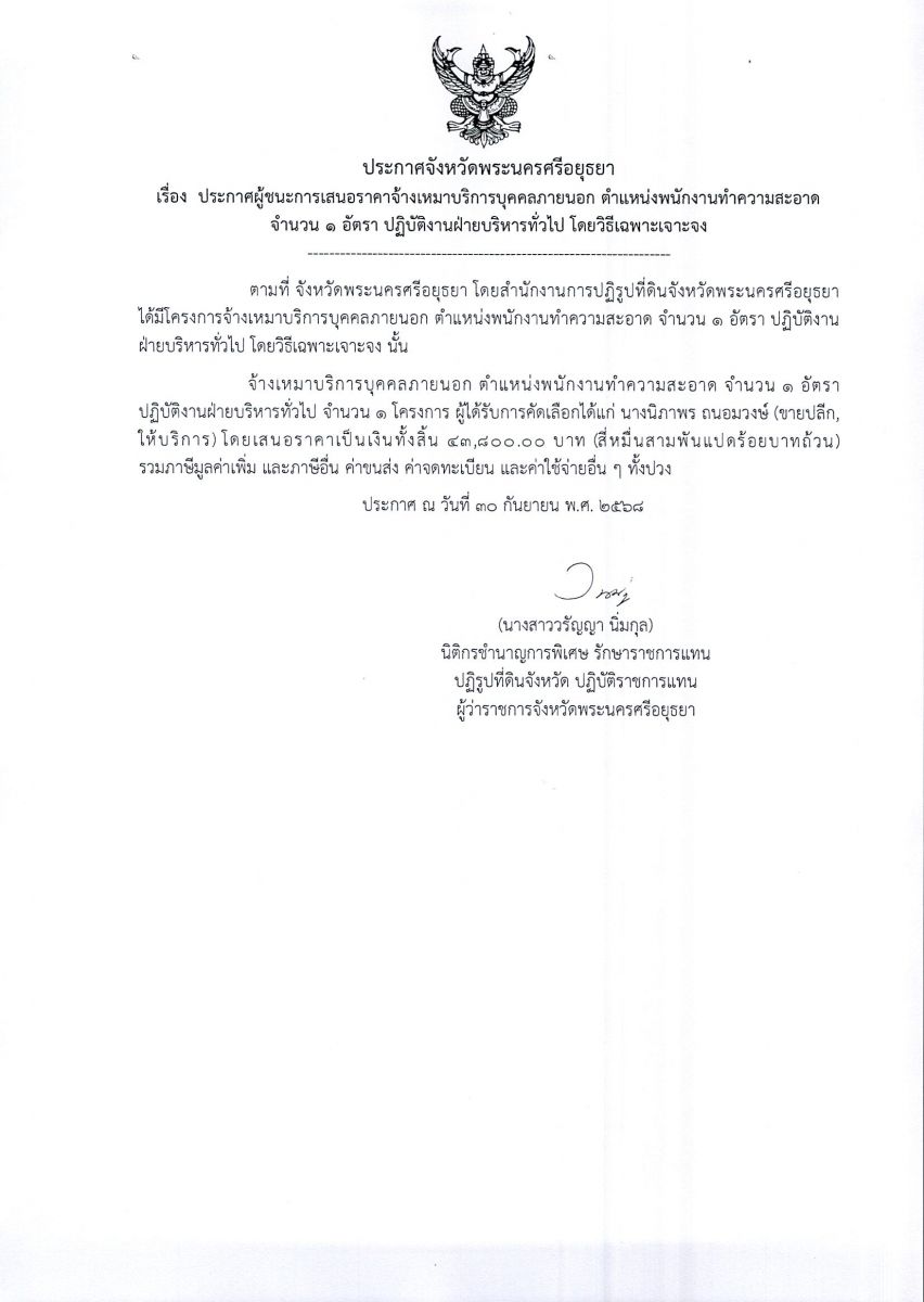 ประกาศผู้ชนะการเสนอราคาจ้างเหมาบริการบุคคลภายนอก ตำแหน่งพนักงานทำความสะอาด จำนวน 1 อัตตรา ปฏิบัติงานฝ่ายบริหารทั่วไป โดยวิธีเฉพาะเจาะจง