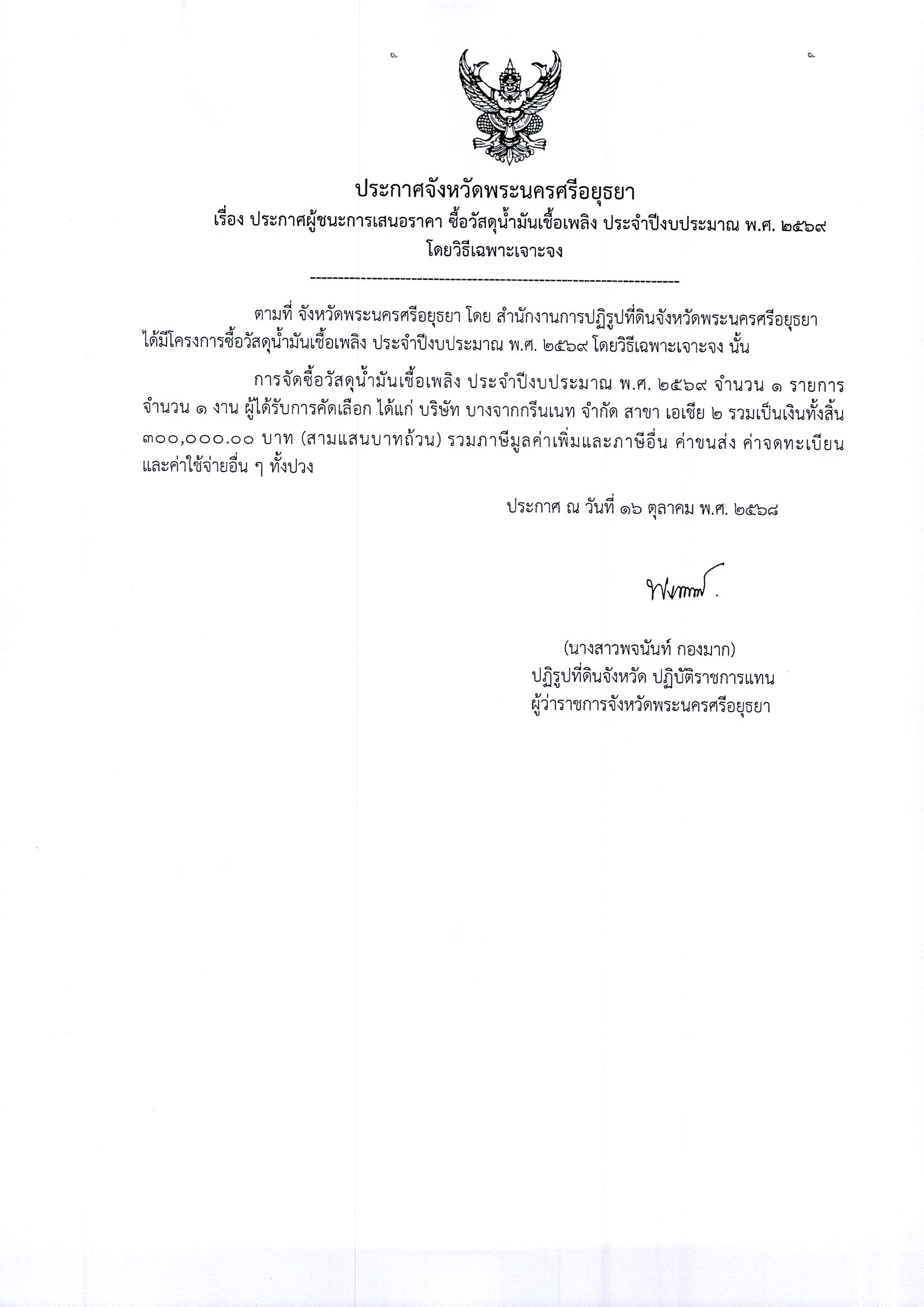 ประกาศผู้ชนะการเสนอราคา ซื้อวัสดุน้ำมันเชื้อเพลิง ประจำปีงบประมาณ พ.ศ.2569 โดยวิธีเฉพาะเจาะจง