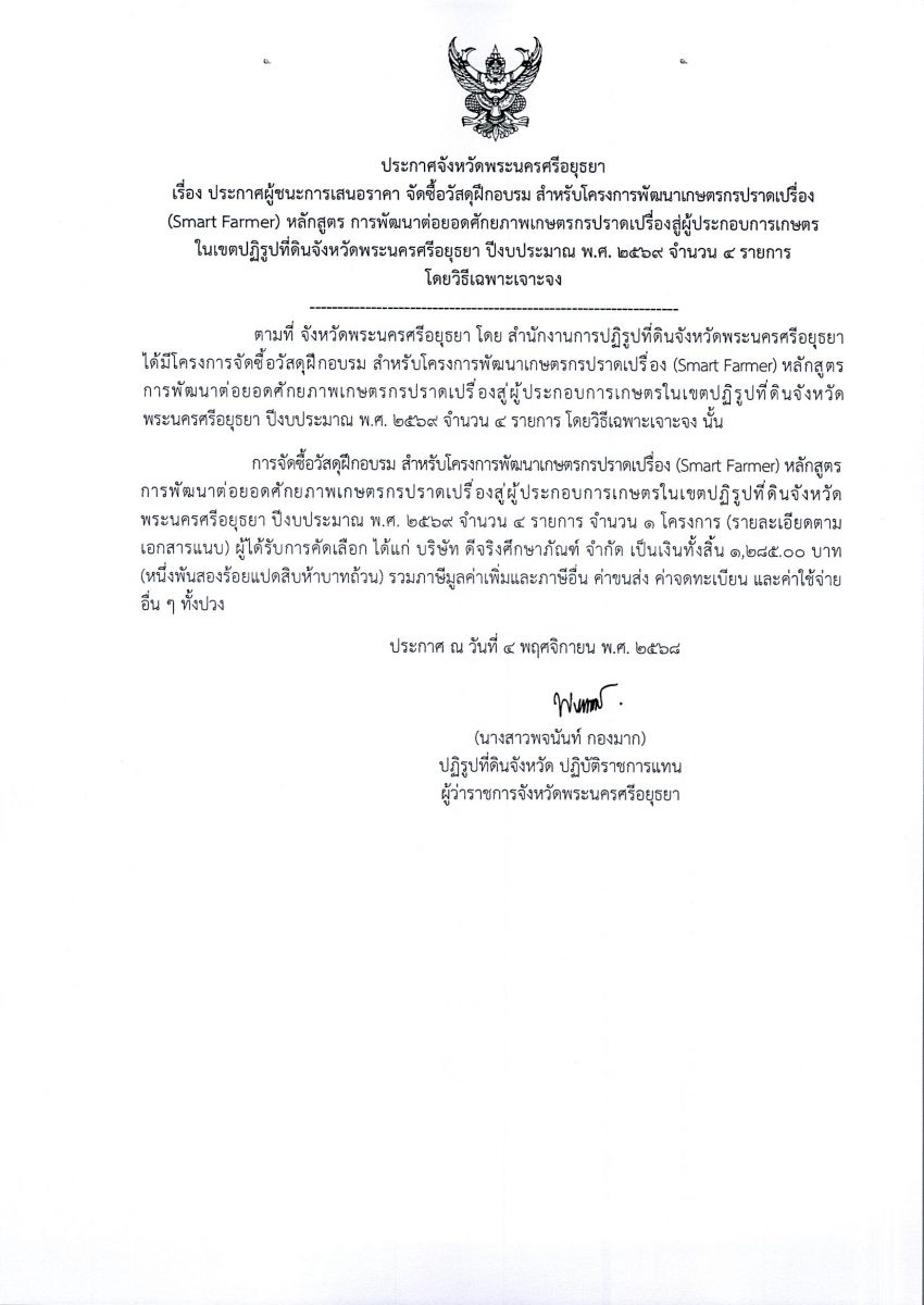 ประกาศผู้ชนะการเสนอราคา จัดซื้อวัสดุฝึกอบรม สำหรับโครงการการพัฒนาเกษตรกรปราดเปรื่อง (Smart Famer) หลักสูตร การพัฒนาต่อยอดศักยภาพเกษตรกรปราดเปรื่องสู่ผู้ประกอบการเกษตร ในเขตปฏิรูปที่ดินจังหวัดพระนครศรีอยุธยา ปีงบประมาณ พ.ศ. 2569 จำนวน 4 รายการ โดยวิธีเฉพาะเจาะจง