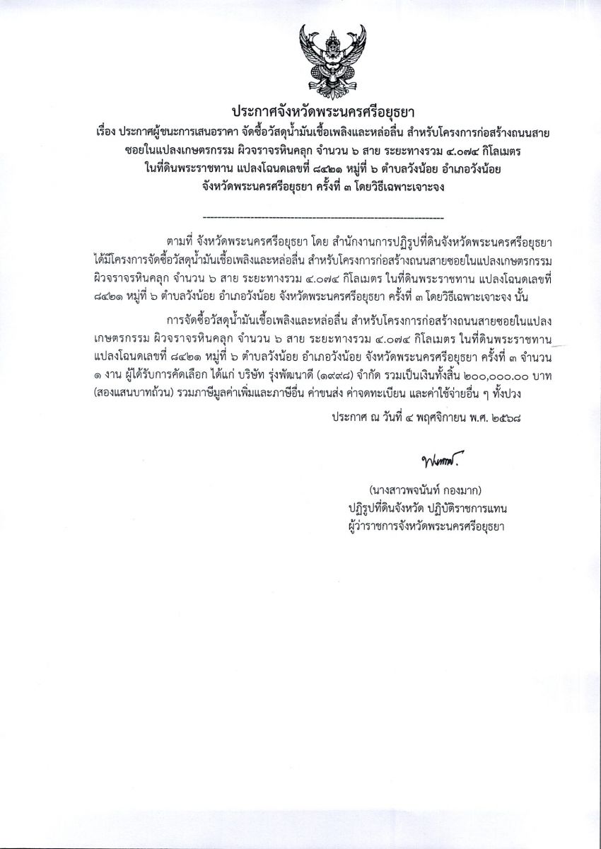 ประกาศผู้ชนะการเสนอราคา จัดซื้อวัสดุน้ำมันเชื้อเพลิงและหล่อลื่น สำหรับโครงการก่อสร้างถนนสายซอยในแปลงเกษตรกรรม ผิวจราจรหินคลุก จำนวน 6 สาย ระยะทางรวม 4.074 กิโลเมตร ในที่ดินพระราชทาน แปลงโฉนดเลขที่ 8421 หมู่ที่ 6 ตำบลวังน้อย อำเภอวังน้อย จังหวัดพระนครศรีอยุธยา ครั้งที่ 3 โดยวิธีเฉพาะเจาะจง
