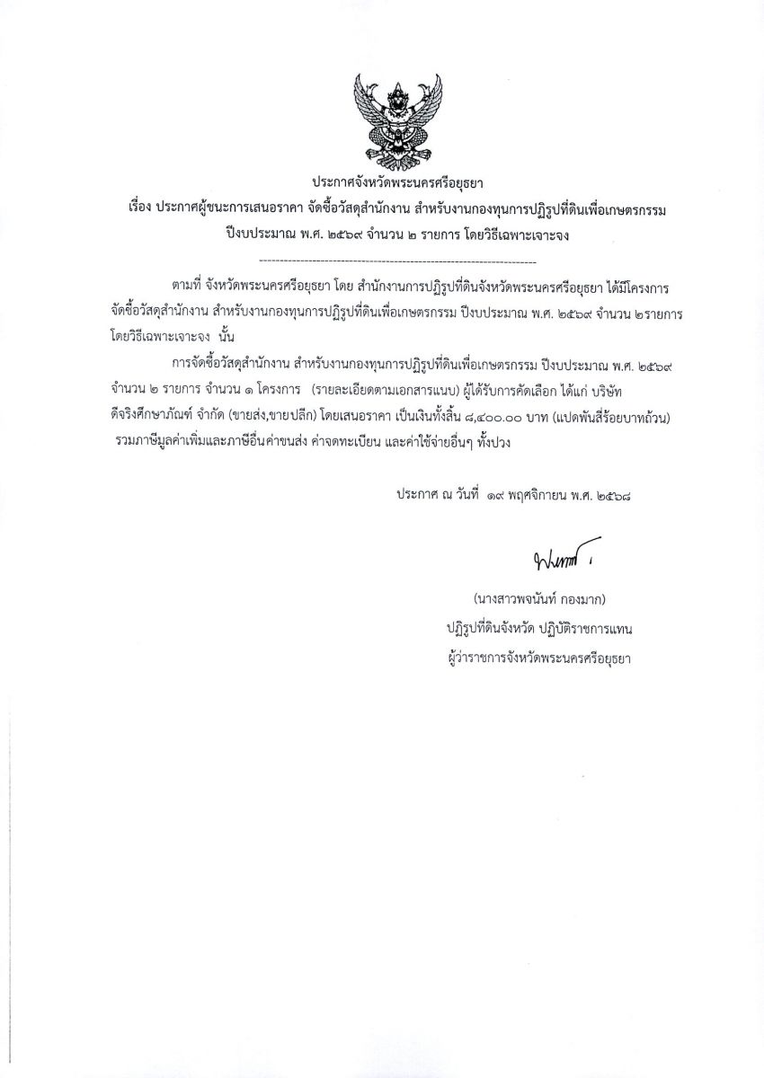 ประกาศผู้ชนะการเสนอราคา จัดซื้อวัสดุสำนักงาน สำหรับงานกองทุนการปฏิรูปที่ดินเพื่อเกษตรกรรม ปีงบประมาณ พ.ศ. 2569 จำนวน 2 รายการ