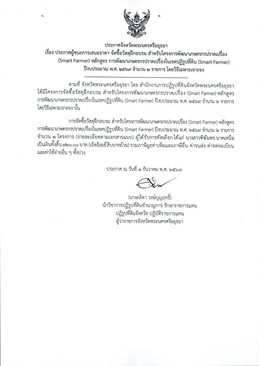ประกาศผู้ชนะการเสนอราคา จัดซื้อวัสดุฝึกอบรม สำหรับโครงการพัฒนาเกษตรกรปราดเปรื่อง (Smart Famer) หลักสูตร การพัฒนาเกษตรกรปราดเปรื่องในเขตปฏิรูปที่ดิน (Smart Famer) ปีงบประมาณ พ.ศ. 2569 จำนวน 2 รายการ โดยวิธีเฉพาะเจาะจง