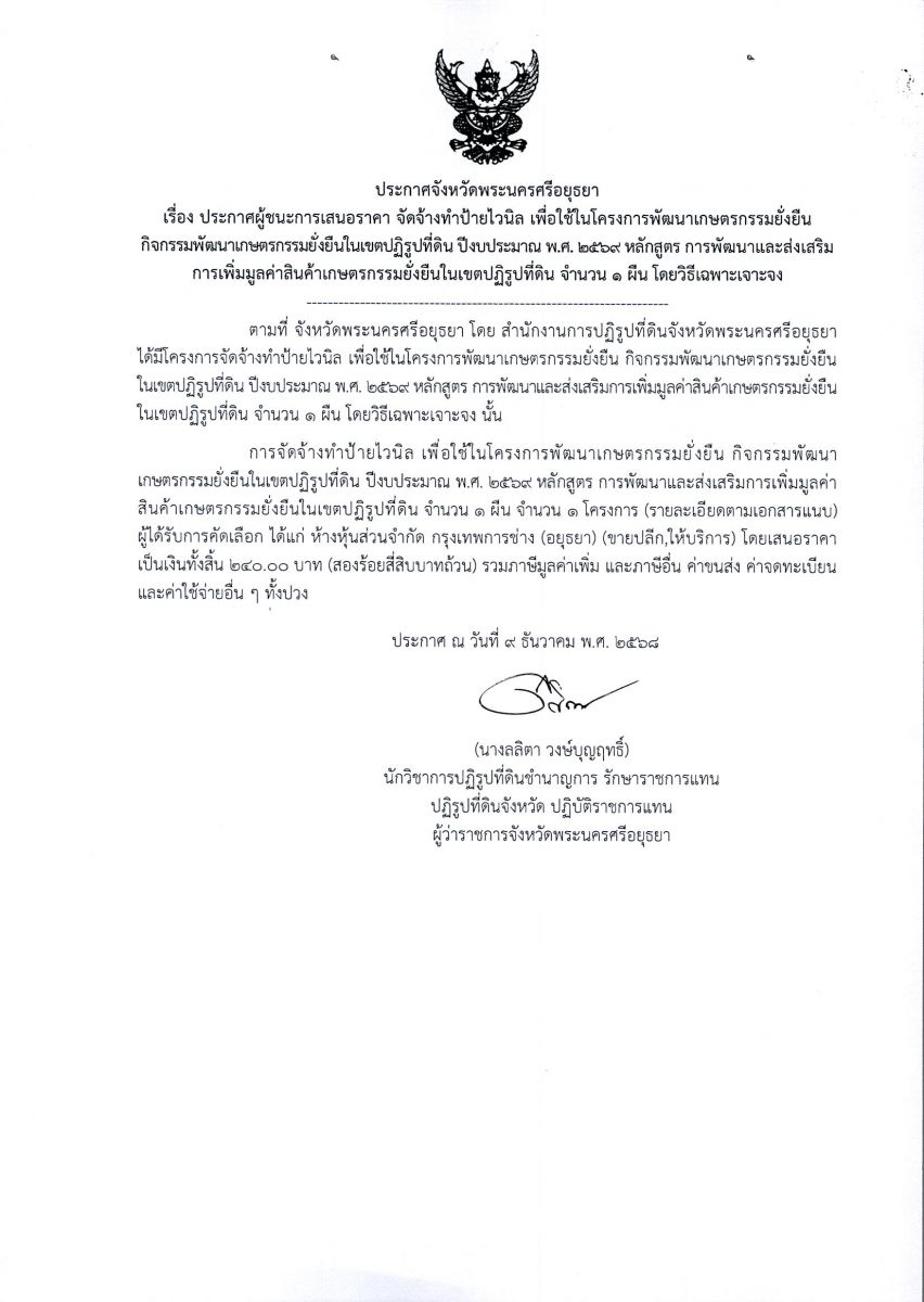 ประกาศผู้ชนะการเสนอราคา จัดจ้างทำป้ายไวนิล เพื่อใช้ในโครงการพัฒนาเกษตรกรรมยั่งยืนกิจกรรมพัฒนาเกษตรกรรมยั่งยืนในเขตปฏิรูปที่ดิน ปีงบประมาณ พ.ศ. 2569 หลักสูตร การขยายผลองค์ความรู้เกษตรกรรมยั่งยืนในเขตปฏิรูปที่ดิน จำนวน 1 ผืน โดยวิธีเฉพาะเจาะจง