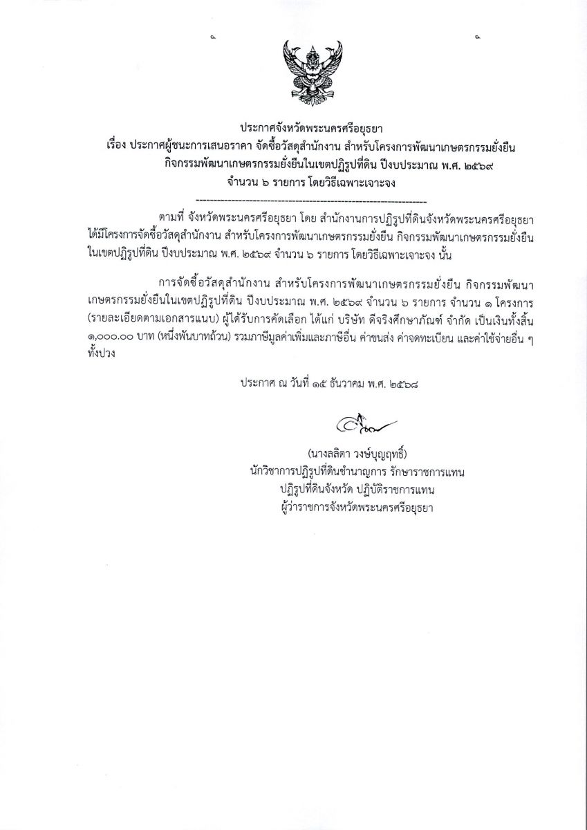 ประกาศผู้ชนะการเสนอราคา จัดซื้อวัสดุสำนักงาน สำหรับโครงการพัฒนาเกษตรกรรมยั่งยืนกิจกรรมพัฒนาเกษตรกรรมยั่งยืนในเขตปฏิรูปที่ดิน ปีงบประมาณ พ.ศ. 2569 จำนวน 6 รายการ โดยวิธีเฉพาะเจาะจง