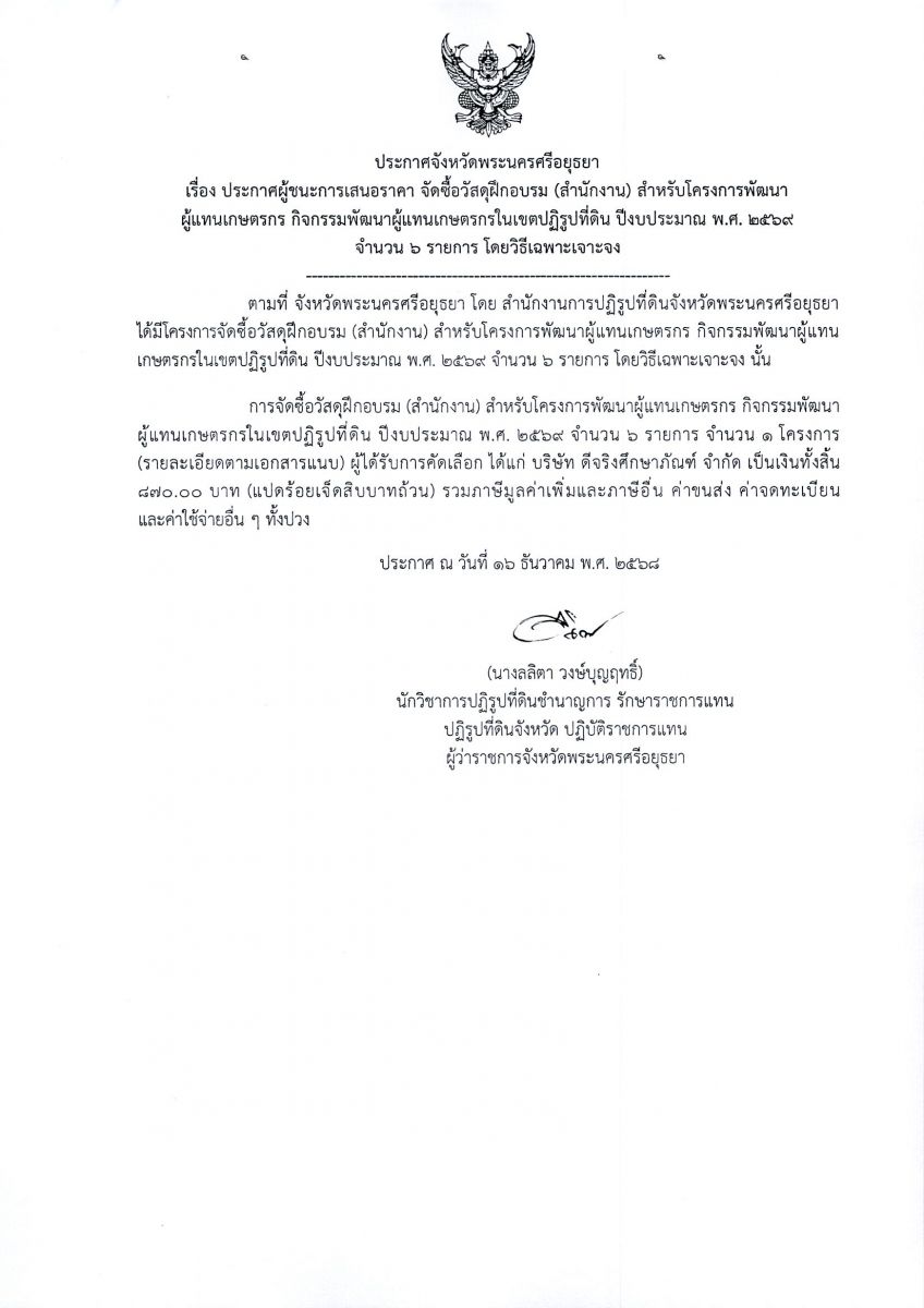 ประกาศผู้ชนะการเสนอราคา จัดซื้อวัสดุฝึกอบรม (สำนักงาน) สำหรับโครงการพัฒนาผู้แทนเกษตรกร กิจกรรมพัฒนาผู้แทนเกษตรกรในเขตปฏิรูปที่ดิน ปีงบประมาณ พ.ศ. 2569 จำนวน 6 รายการ โดยวิธีเฉพาะเจาะจง