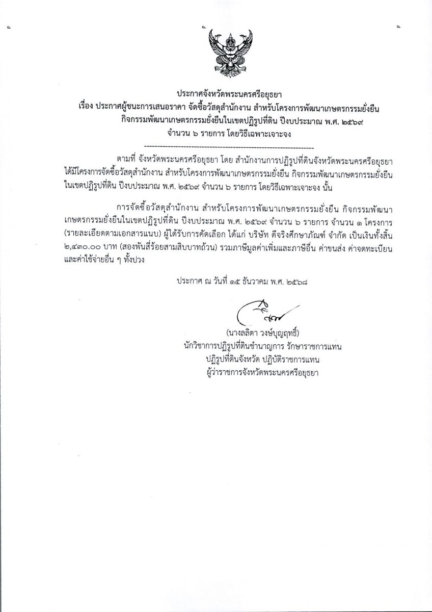 ประกาศผู้ชนะการเสนอราคา จัดซื้อวัสดุสำนักงาน สำหรับโครงการพัฒนาเกษตรกรรมยั่งยืนกิจกรรมพัฒนาเกษตรกรรมยั่งยืนในเขตปฏิรูปที่ดิน ปีงบประมาณ พ.ศ. 2569 จำนวน 6 รายการ โดยวิธีเฉพาะเจาะจง