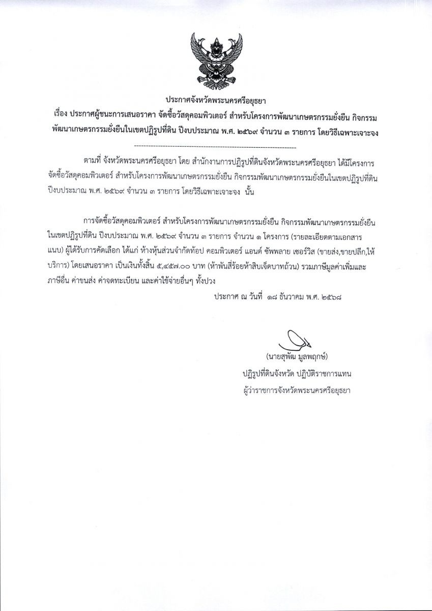 ประกาศผู้ชนะการเสนอราคา จัดซื้อวัสดุคอมพิวเตอร์ สำหรับโครงการพัฒนาเกษตรกรรมยั่งยืน กิจกรรมพัฒนาเกษตรกรรมยั่งยืนในเขตปฏิรูปที่ดิน ปีงบประมาณ พ.ศ. 2569 จำนวน 3 รายการ โดยวิธีเฉพาะเจาะจง