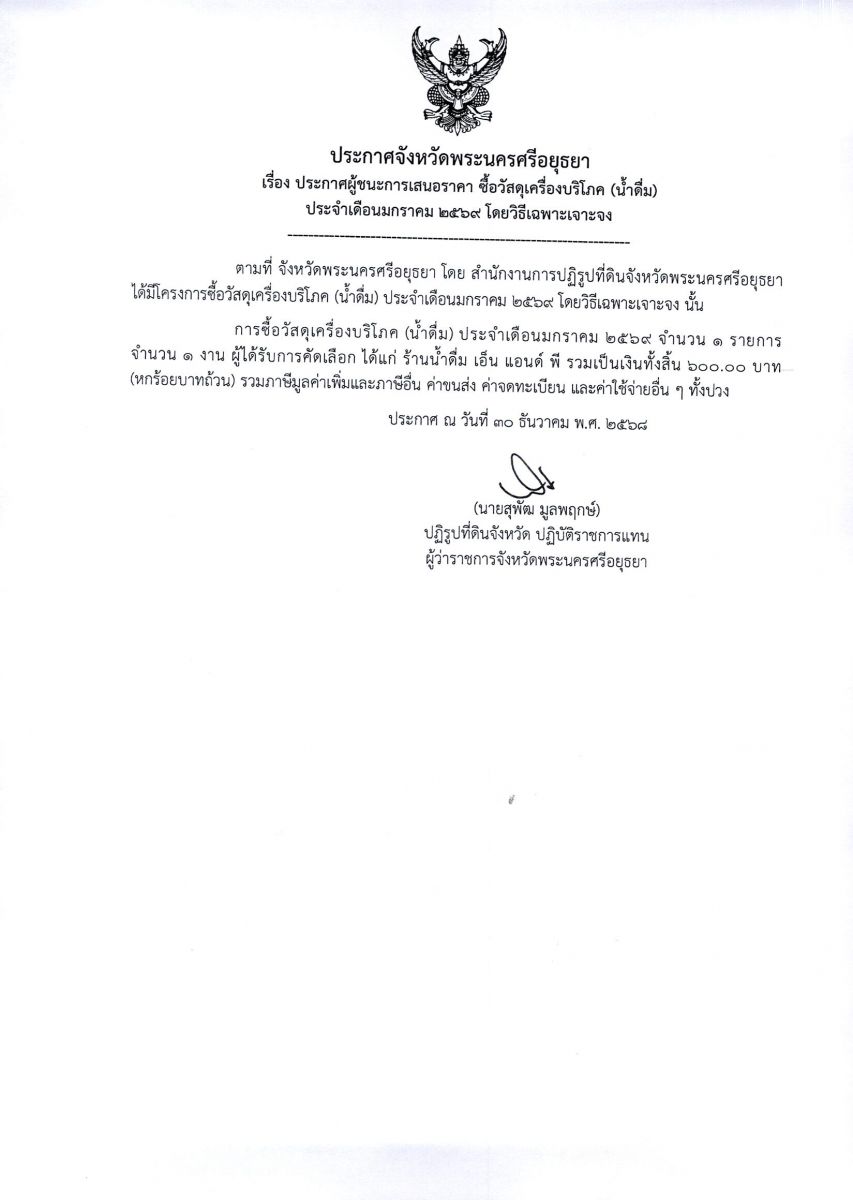 ประกาศผู้ชนะการเสนอราคา ซื้อวัสดุเครื่องดื่มบริโภค (น้ำดื่ม) ประจำเดือนมกราคม 2569 โดยวิธีเฉพาะเจาะจง