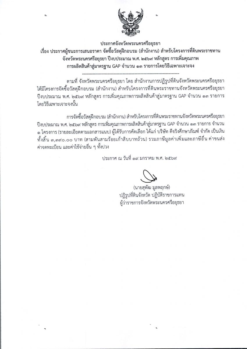 ประกาศผู้ชนะการเสนอราคา จัดซื้อวัสดุฝึกอบรม (สำนักงาน) สำหรับโครงการที่ดินพระราชทานจังหวัดพระนครศรีอยุธยา ปีงบประมาณ พ.ศ. 2569 หลักสูตร การเพิ่มคุณภาพการผลิตสินค้าสู่มาตราฐาน GAP จำนวย 13 รายการ โดยวิธีเฉพาะเจาะจง