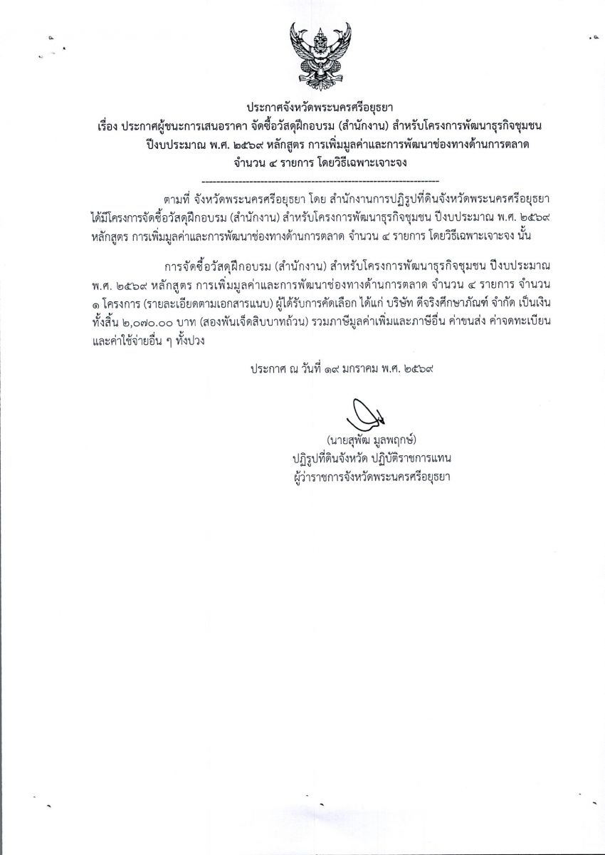 ประกาศผู้ชนะการเสนอราคา จัดซื้อวัสดุฝึกอบรม (สำนักงาน) สำหรับโครงการพัฒนาธุรกิจชุมชน ปีงบประมาณ พ.ศ. 2569 หลักสูตร การเพิ่มมูลค่าและพัฒนาช่องทางด้านการตลาด จำนวน 4 รายการ โดยวิธีเฉพาะเจาะจง