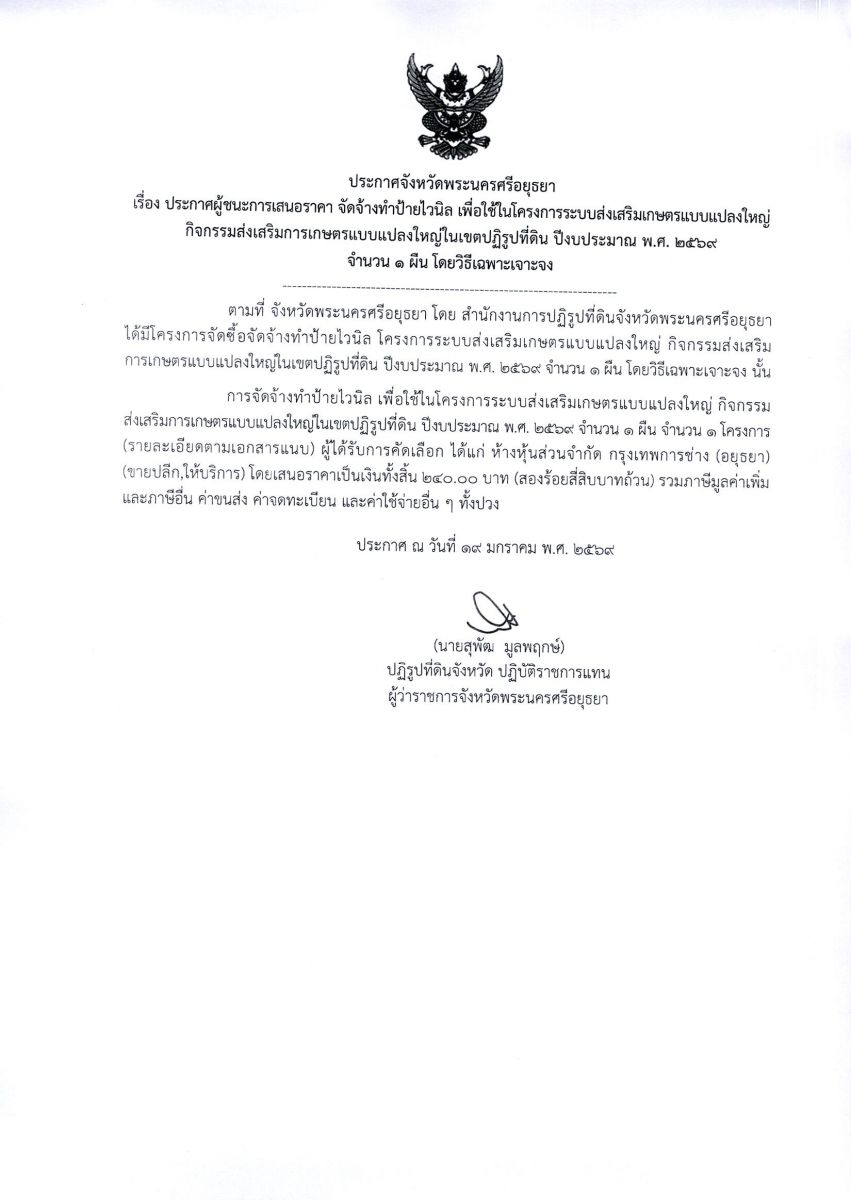 ประกาศผู้ชนะการเสนอราคา จัดจ้างทำป้ายไวนิล เพื่อใช้ในโครงการระบบส่งเสริมเกษตรแบบแปลงใหญ่ กิจกรรมส่งเสริมเกษตรแบบแปลงใหญ่ในเขตปฏิรูปที่ดิน ปีงบประมาณ พ.ศ. 2569 จำนวน 1 ผืน โดยวิธีเฉพาะเจาะจง