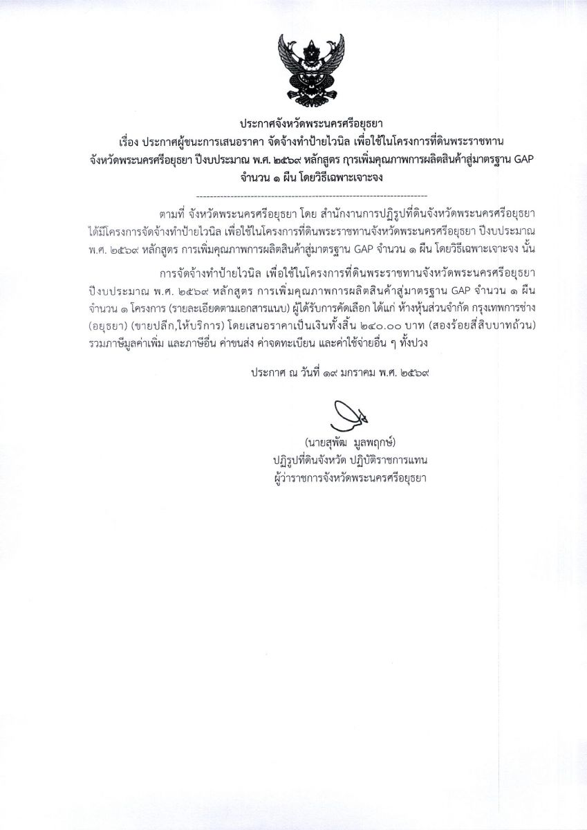 ประกาศผู้ชนะการเสนอราคา จัดจ้างทำป้ายไวนิล เพื่อใช้ในโครงการที่ดินพระราชทานจังหวัดพระนครศรีอยุธยา ปีงบประมาณ พ.ศ. 2569 หลักสูตร การเพิ่มคุณภาพการผลิตสินค้าสู่มาตรฐาน GAP จำนวน 1 ผืน โดยวิธีเฉพาะเจาะจง