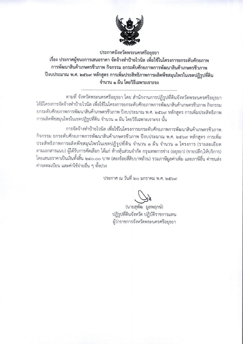 ประกาศผู้ชนะการเสนอราคา จัดจ้างทำป้ายไวนิล เพื่อใช้ในโครงการยกระดับศักยภาพการพัฒนาสินค้าเกษตรชีวภาพ กิจกรรม ยกระดับศักยภาพการพัฒนาสินค้าเกษตรชีวภาพ ปีงบประมาณ พ.ศ. 2569 หลักสูตร การเพิ่มประสิทธิภาพการผลิตพืชสมุนไพรในเขตปฏิรูปที่ดิน จำนวน 1 ผืน โดยวิธีเฉพาะเจาะจง