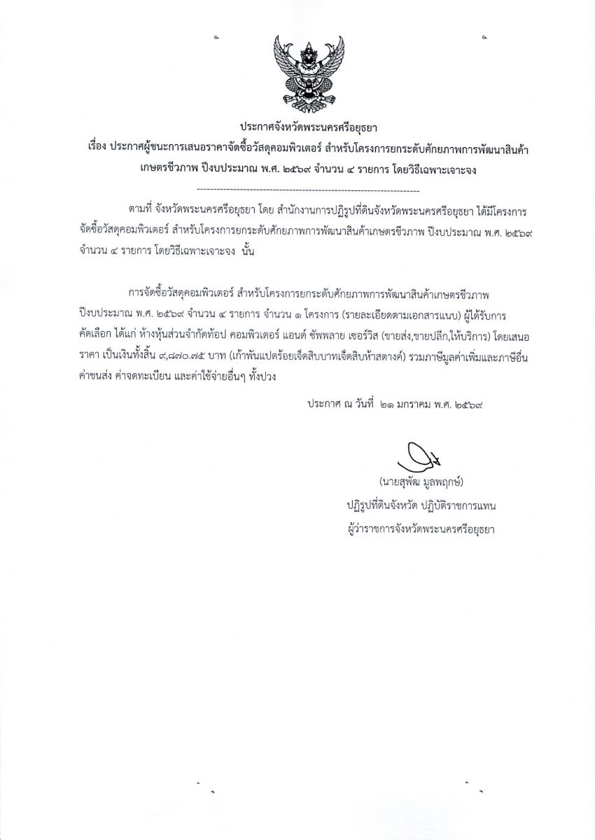 ประกาศผู้ชนะการเสนอราคาจัดซื้อวัสดุคอมพิวเตอร์ สำหรับโครงการยกระดับศักยภาพการพัฒนาสินค้าเกษตรชีวภาพ ปีงบประมาณ พ.ศ. 2569 จำนวน 4 รายการ โดยวิธีเฉพาะเจาะจง