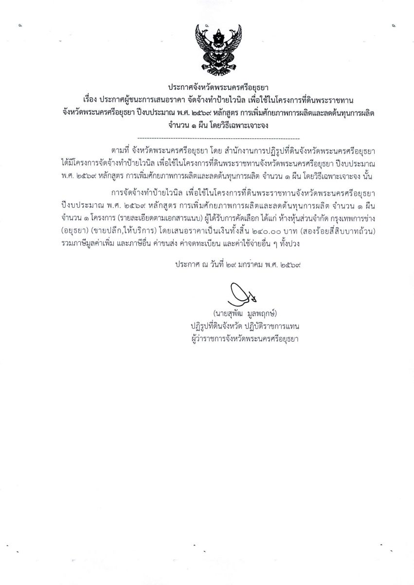ประกาศผู้ชนะการเสนอราคา จัดจ้างทำป้ายไวนิล เพื่อใช้ในโครงการที่ดินพระราชทานจังหวัดพระนครศรีอยุธยา ปีงบประมาณ พ.ศ. 2569 หลักสูตร การเพิ่มศักยภาพการผลิตและลดต้นทุนการผลิต จำนวน 1 ผืน โดยวิธีเฉพาะเจาะจง