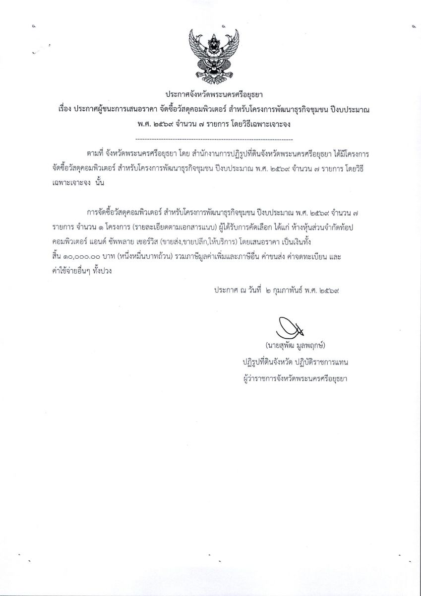 ประกาศผู้ชนะการเสนอราคา จัดซื้อวัสดุคอมพิวเตอร์ สำหรับโครงการพัฒนาธุรกิจชุมชน ปีงบประมาณ พ.ศ. 2569 จำนวน 7 รายการ โดยวิธีเฉพาะเจาะจง