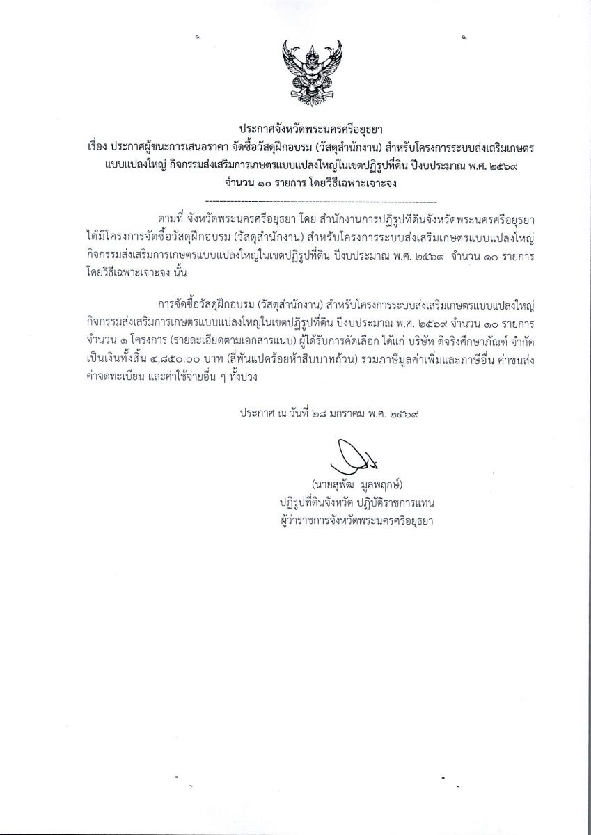ประกาศผู้ชนะการเสนอราคา จัดซื้อวัสดุฝึกอบรม (สำนักงาน) สำหรับโครงการระบบส่งเสริมเกษตรแบบแปลงใหญ่ กิจกรรมส่งเสริมการเกษตรแบบแปลงใหญ่ในเขตปฏิรูปที่ดิน ปีงบประมาณ พ.ศ. 2569 จำนวน 10 รายการ โดยวิธีเฉพาะเจาะจง