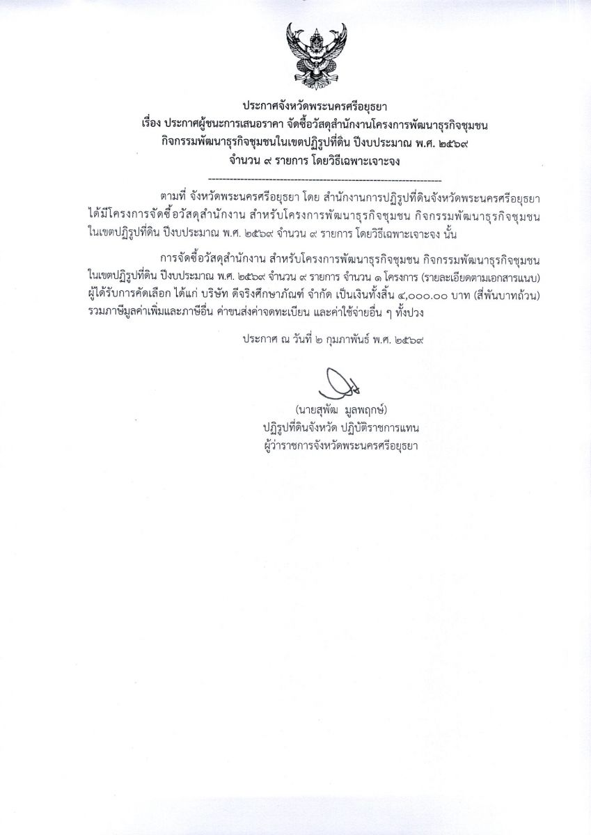ประกาศผู้ชนะการเสนอราคา จัดซื้อวัสดุสำนักงานโครงการพัฒนาธุรกิจชุมชน กิจกรรมพัฒนาธุรกิจชุมชนในเขตปฏิรูปที่ดิน ปีงบประมาณ พ.ศ. 2569 จำนวน 9 รายการ โดยวิธีเฉพาะเจาะจง