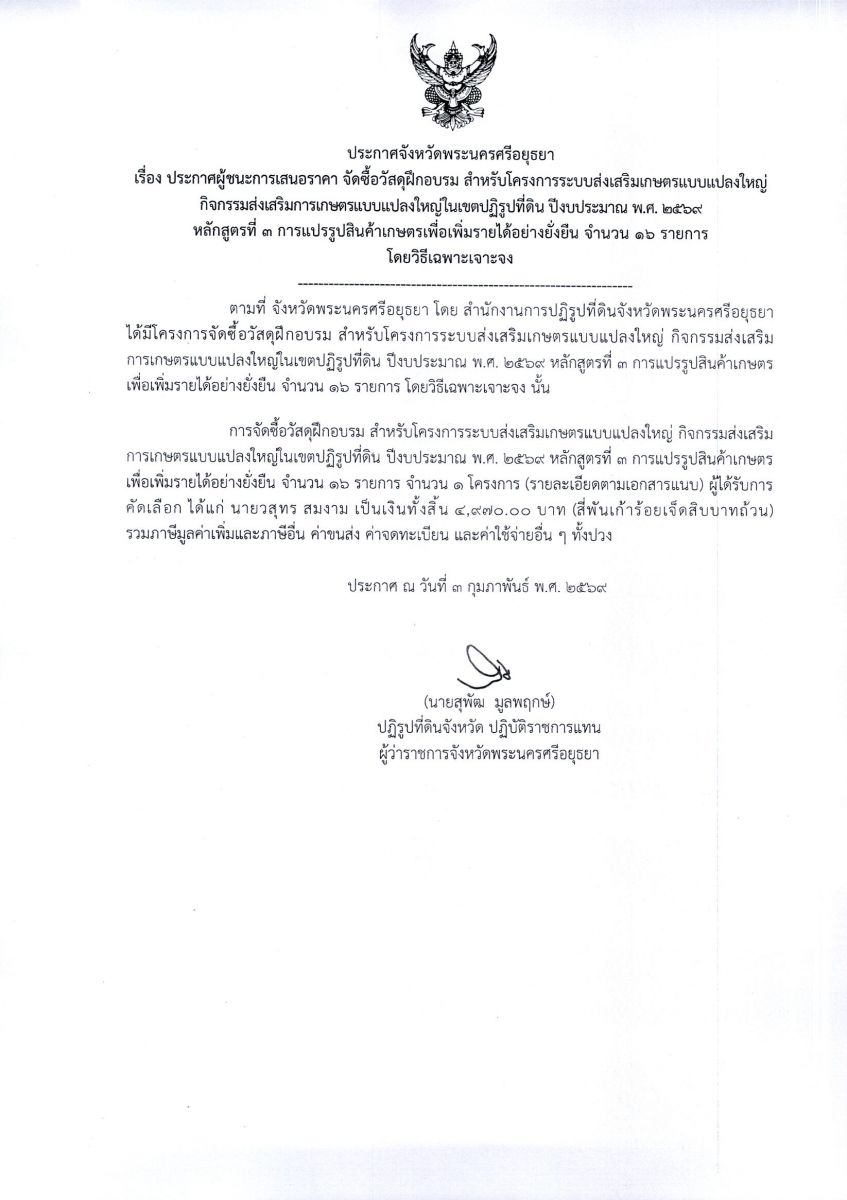 ประกาศผู้ชนะการเสนอราคา จัดซื้อวัสดุฝึกอบรม สำหรับโครงการระบบส่งเสริมเกษตรแบบแปลงใหญ่กิจกรรมส่งเสริมเกษตรแบบแปลงใหญ่ในเขตปฏิรูปที่ดิน ปีงบประมาณ พ.ศ. 2569 หลักสูตรที่ 3 การแปรรูปสินค้าเกษตรเพื่อเพิ่มรายได้อย่างยั่งยืน จำนวน 16 รายการ โดยวิธีเฉพาะเจาะจง
