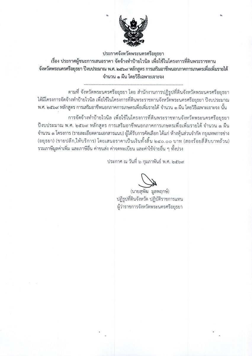 ประกาศผู้ชนะการเสนอราคา จัดจ้างทำป้ายไวนิล เพื่อใช้ในโครงการที่ดินพระราชทานจังหวัดพระนครศรีอยุธยา ปีงบประมาณ พ.ศ. 2569 หลักสูตร การเสริมอาชีพนอกภาคการเกษตรเพื่อเพิ่มรายได้ จำนวน 1 ผืน โดยวิธีเฉพาะเจาะจง