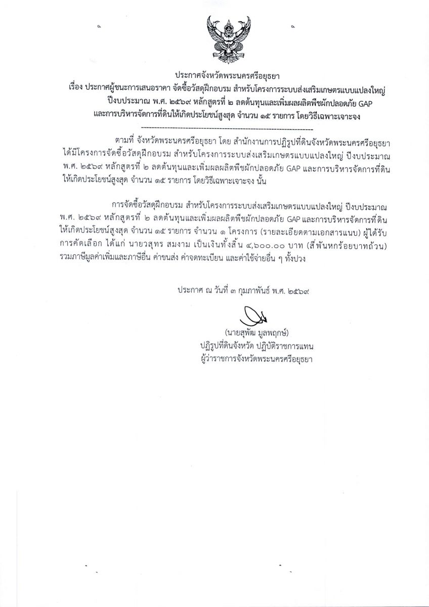 ประกาศผู้ชนะการเสนอราคา จัดซื้อวัสดุฝึกอบรม สำหรับโครงการส่งเสริมเกษตรแบบแปลงใหญ่ ปีงบประมาณ พ.ศ. 2569 หลักสูตรที่ 2 ลดต้นทุนและเพิ่มผลผลิตพืชผักปลอดภัย GAP และการบริหารจัดการที่ดินให้เกิดเป็นประโยชน์สูงสุด จำนวน 15 รายการ โดยวิธีเฉพาะเจาะจง