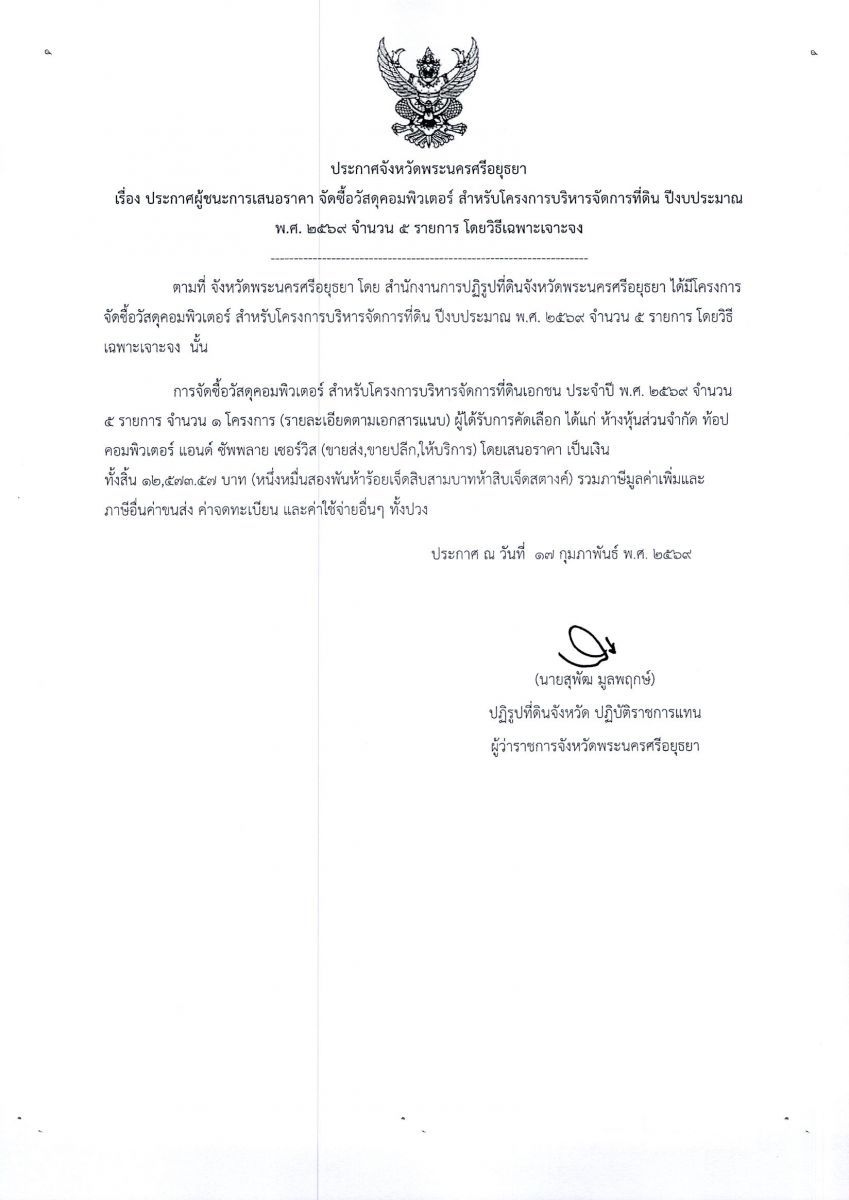 ประกาศผู้ชนะการเสนอราคา จัดซื้อวัสดุคอมพิวเตอร์ สำหรับโครงการบริหารจัดการที่ดิน ปีงบประมาณ พ.ศ. 2569 จำนวน 5 รายการ โดยวิธีเฉพาะเจาะจง