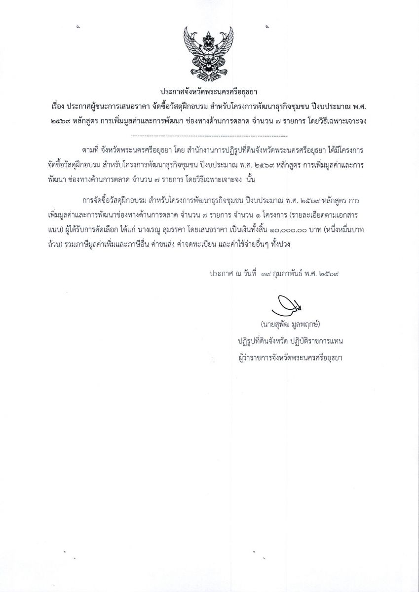 ประกาศผู้ชนะการเสนอราคา จัดซื้อวัสดุฝึกอบรม สำหรับโครงการพัฒนาธุรกิจชุมชน ปีงบประมาณ พ.ศ. 2569 หลักสูตร การเพิ่มมูลค่าและการพัฒนา ช่องทางด้านการตลาด จำนวน 7 รายการ โดยวิธีเฉพาะเจาะจง