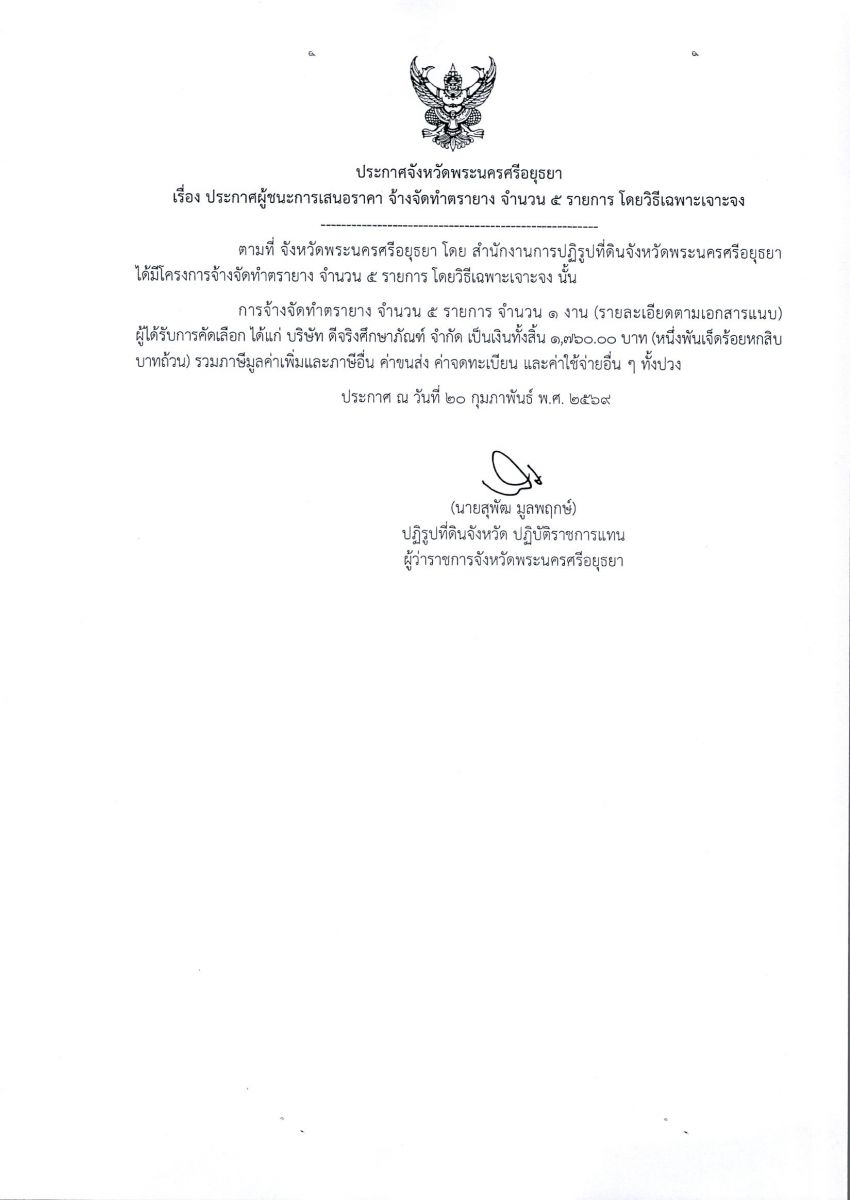 ประกาศผู้ชนะการเสนอราคา จัดจ้างทำตรายาง จำนวน 5 รายการ โดยวิธีเฉพาะเจาะจง