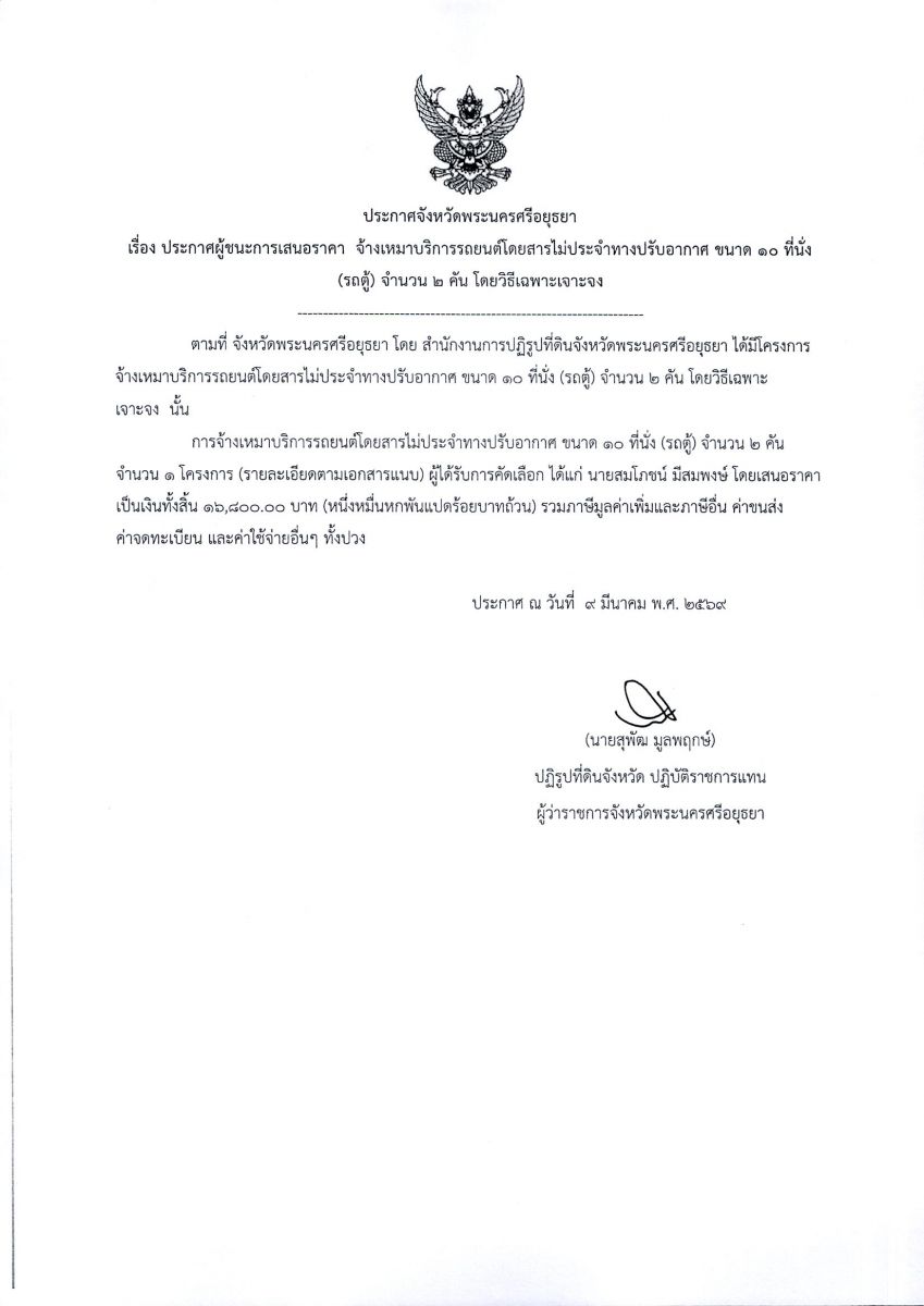 ประกาศผู้ชนะการเสนอราคา จ้างเหมาบริการรถยนต์โดยสารไม่ประจำทางปรับอากาศ ขนาด 10 ที่นั้ง (รถตู้) จำนวน 2 คัน โดยวิธีเฉพาะเจาะจง