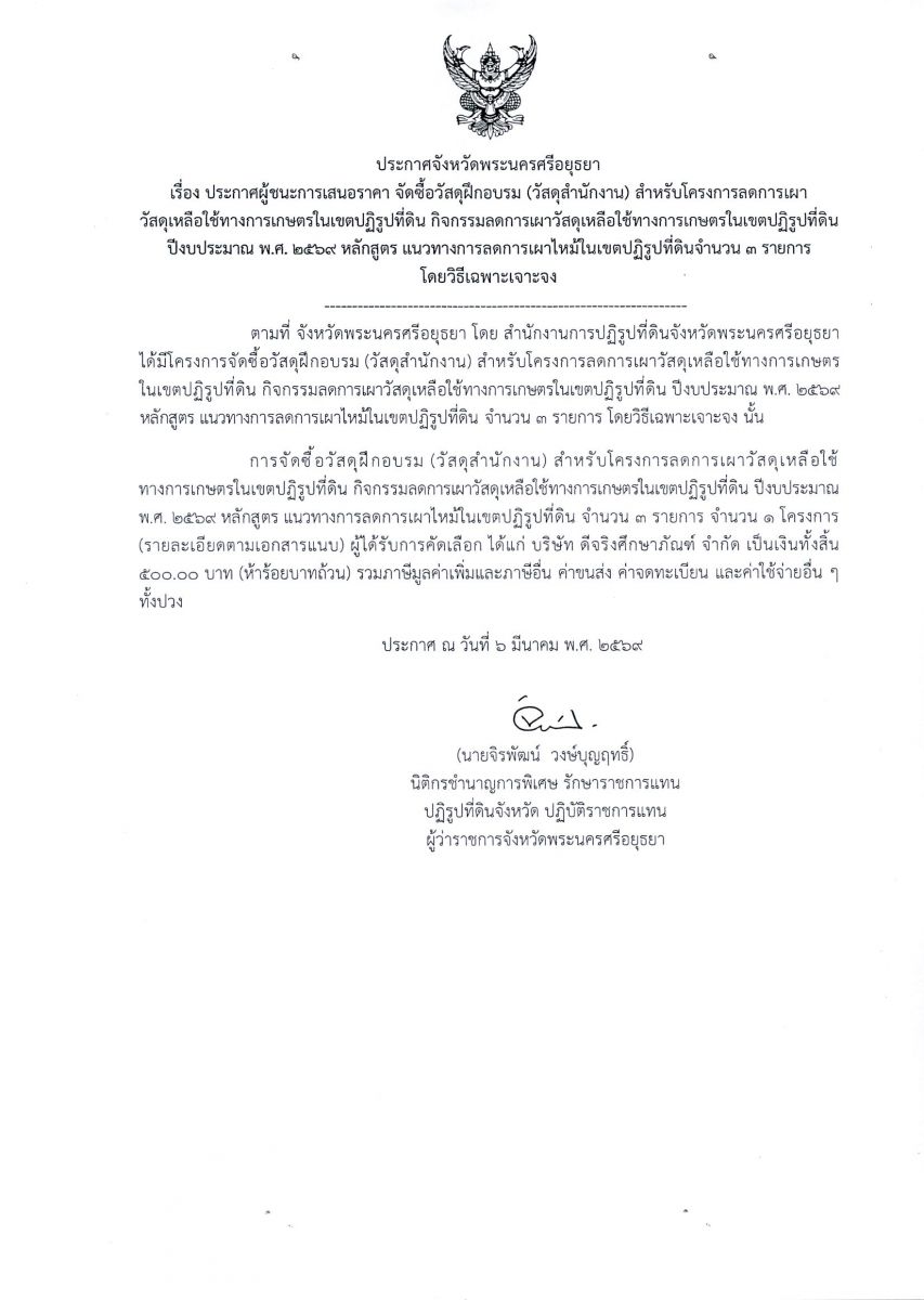 ประการศผู้ชะการเสนอราคา จัดซื้อวัสดุฝึกอบรม (วัสดุสำนักงาน) โครงการลดการเผาวัสดุเหลือใช้ทางการเกษตรในเขตปฏิรูปที่ดิน กิจกรรมลดการเผาวัสดุเหลือใช้ทางการเกษตรในเขตปฏิรูปที่ดิน ปีงบประมาณ พ.ศ. 2569 หลักสูตร แนวทางการลดการเผาไหม้ในเขตปฏิรูปที่ดิน จำนวน 3 รายการ โดยวิธีเฉพาะเจาะจง