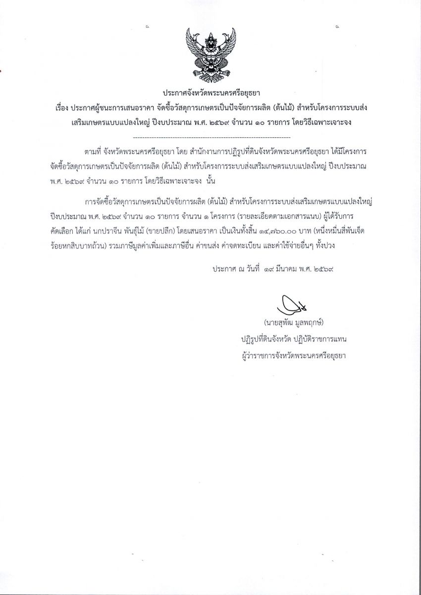 ประกาศผู้ชนะการเสนอราคา จัดซื้อวัสดุการเกษตร (ปัจจัยการผลิต) สำหรับโครงการพัฒนาเกษตรกรปราดเปรื่อง (Smart Farmer) กิจกรรมพัฒนาเกษตรกรปราดเปรื่องในเขตปฏิรูปที่ดิน (Smart Farmer) ปีงบประมาณ พ.ศ. 2569 จำนวน 4 รายการ โดยวิธีเฉพาะเจาะจง