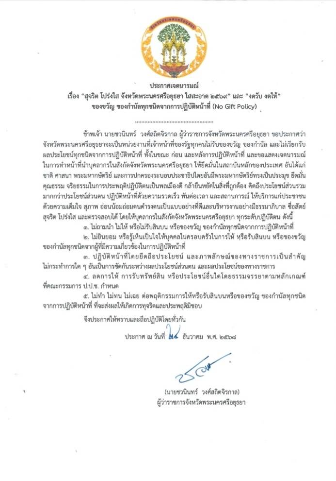 ประกาศเจตนารมณ์ "สุจริต โปร่งใส จังหวัดพระนครศรีอยุธยาใสสะอาด 2569" และ "งดรับ งดให้" ของขวัญ ของกำนัลทุกชนิดจากการปฏิบัติหน้าที่