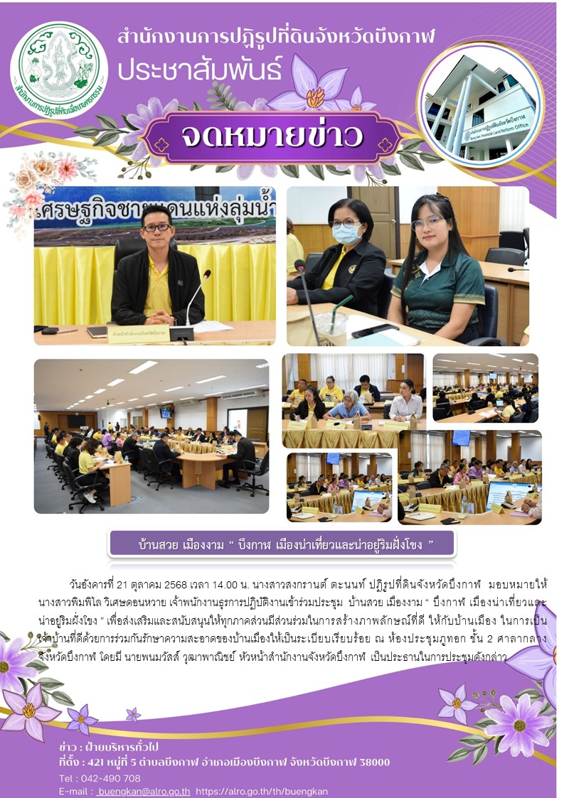 วันอังคารที่ 21 ตุลาคม 2568 เวลา 14.00 น. นางสาวสงกรานต์ ตะนนท์ ปฎิรูปที่ดินจังหวัดบึงกาฬ มอบหมายให้ นางสาวพิมพิไล วิเศษดอนหวาย เจ้าพนักงานธุรการปฏิบัติงาน เข้าร่วมประชุม บ้านสวย เมืองงาม “ บึงกาฬ เมืองน่าเที่ยวและน่าอยู่ริมฝั่งโขง ” เพื่อส่งเสริมและสนับสนุนให้ทุกภาคส่วนมีส่วนร่วมในการสร้างภาพลักษณ์ที่ดี ให้กับบ้านเมือง ในการเป็นเจ้าบ้านที่ดีด้วยการร่วมกันรักษาความสะอาดของบ้านเมืองให้เป็นระเบียบเรียบร้อย ณ ห้องประชุมภูทอก ชั้น 2 ศาลากลางจังหวัดบึงกาฬ โดยมี นายพนมวัสส์ วุฒาพาณิชย์ หัวหน้าสำนักงานจังหวัดบึงกาฬ เป็นประธานในการประชุมดังกล่าว