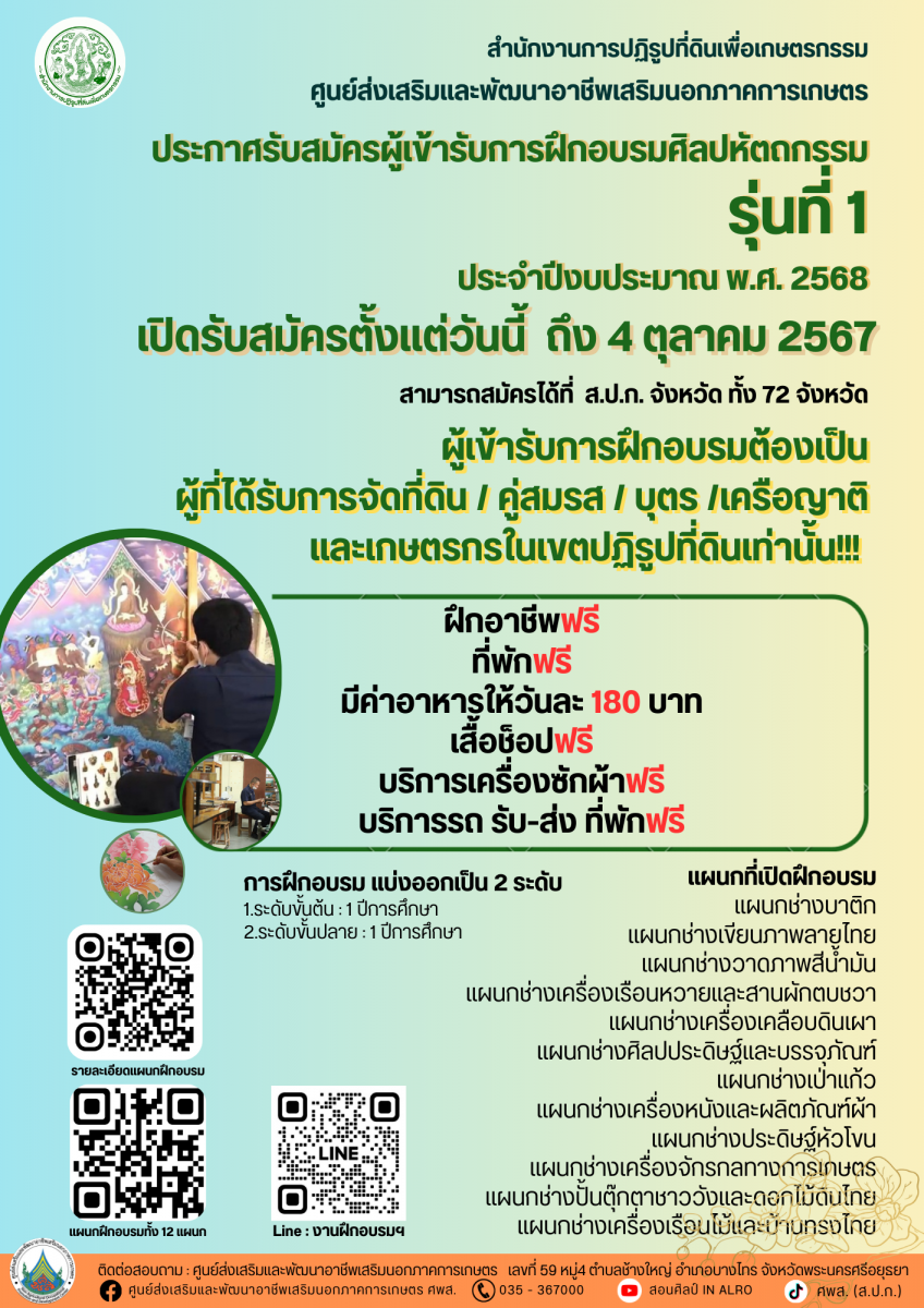 รับสมัครเกษตรกรฝึกอบรมหลักสูตรศิลปาชีพเพื่อผู้สนใจ(ระยะยาว) ระหว่างวันที่ 21 ตุลาคม 2567 - 30 กันยายน 2568 ณ ศูนย์ส่งเสริมและพัฒนาอาชีพอาชีพเสริมนอกภาคการเกษตร ตำบลช้างใหญ่ อำเภอบางไทร จังหวัดพระนครศรีอยุธยา