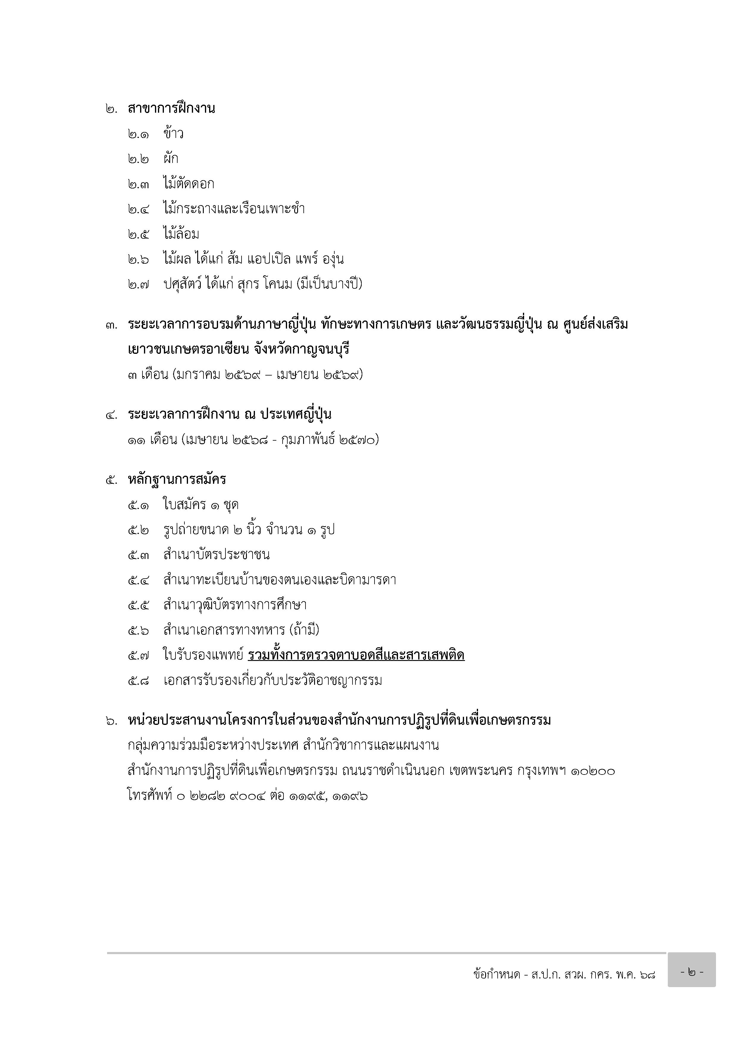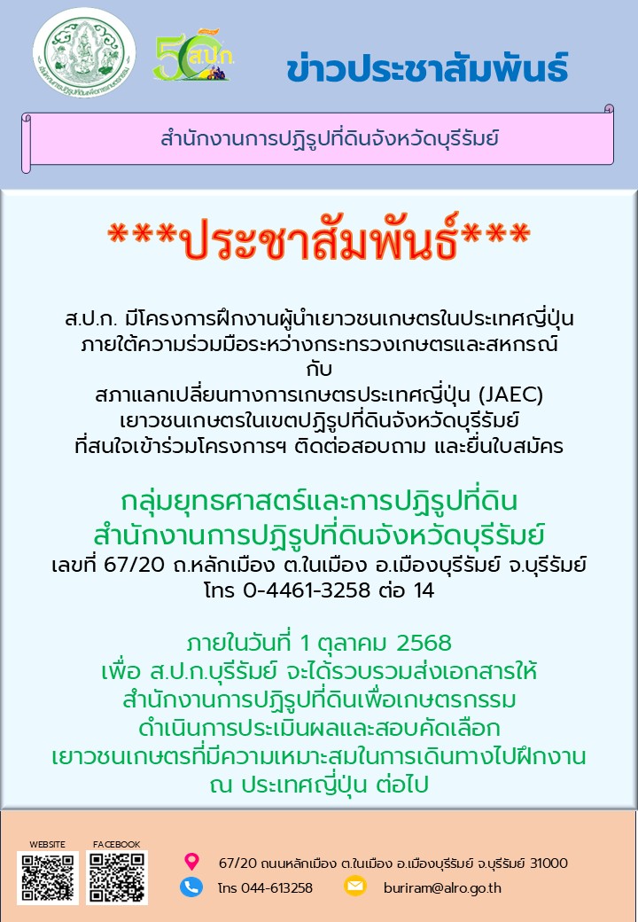 ประชาสัมพันธ์รับสมัครเยาวชนเกษตรในเขตปฏิรูปที่ดินเข้าร่วมโครงการฝึกงานผู้นำเยาวชนเกษตรไทยในประเทศญี่ปุ่นประจำปีงบประมาณ พ.ศ. 2569