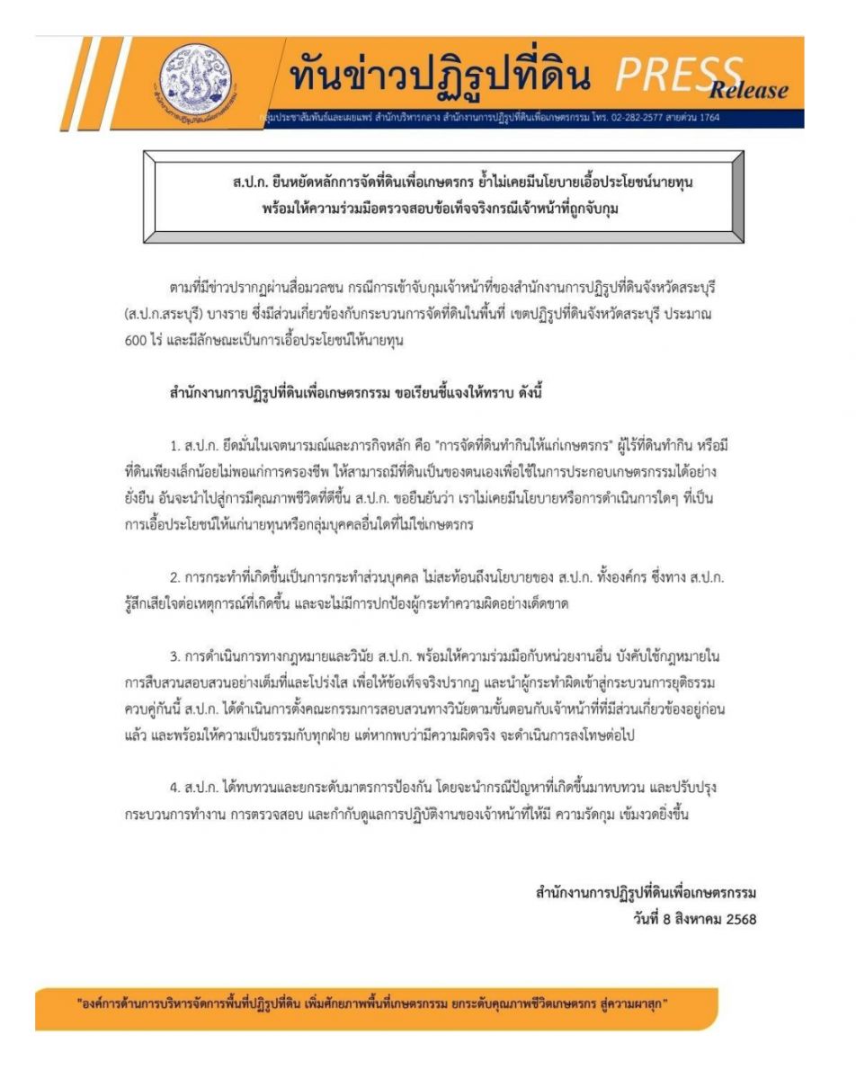 ส.ป.ก. ยืนหยัดหลักการจัดที่ดินเพื่อเกษตรกร ย้ำไม่เคยมีนโยบายเอื้อประโยชน์นายทุน พร้อมให้ความร่วมมือตรวจสอบข้อเท็จจริงกรณีเจ้าหน้าที่ถูกจับกุม