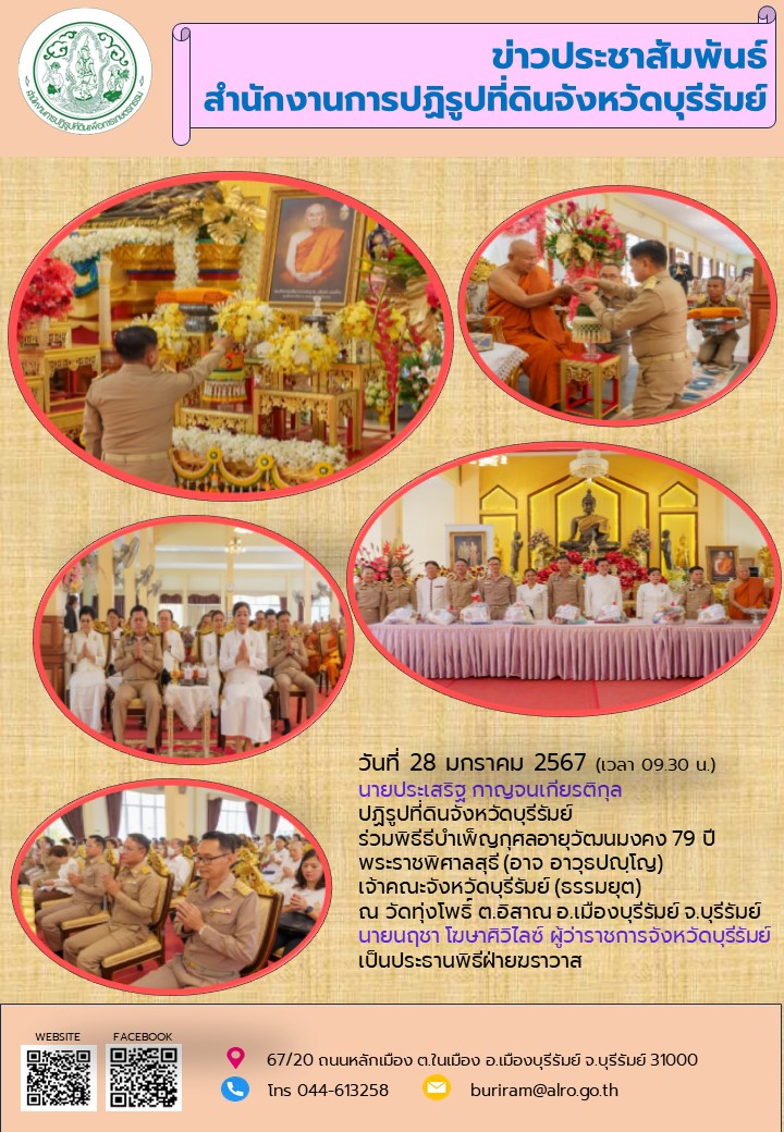 ปฏิรูปที่ดินจังหวัดบุรีรัมย์ ร่วมพิธีบำเพ็ญกุศลอายุวัฒนมงคล 79 ปี พระราชพิศาลสุธี (อาจ อาวุธปญฺโญ) เจ้าคณะจังหวัดบุรีรัมย์ (ธรรมยุต) เจ้าอาวาสวัดทุ่งโพธิ์