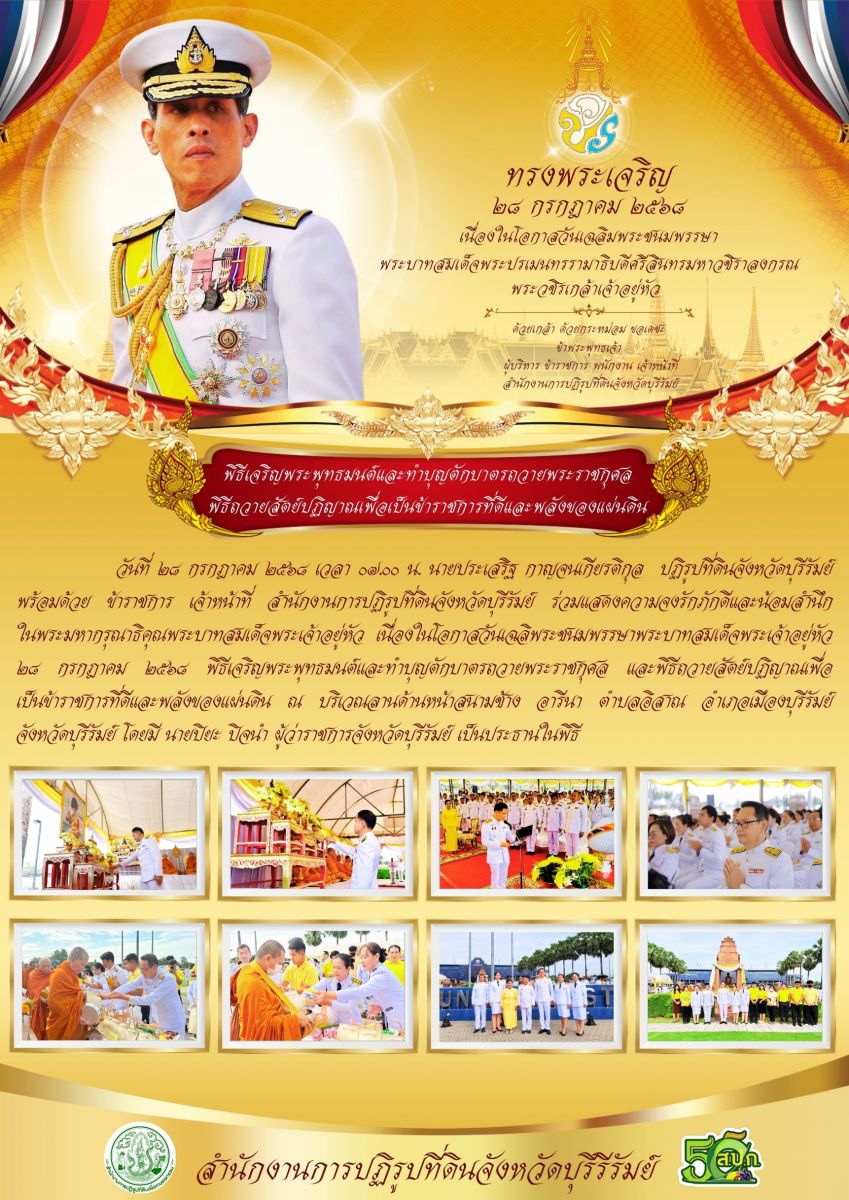 วันที่ 28 กรกฎาคม 2568 เวลา 07.00 น.นายประเสริฐ กาญจนเกียรติกุล ปฏิรูปที่ดินจังหวัดบุรีรัมย์ พร้อมด้วยข้าราชการ เจ้าหน้าที่ ส.ป.ก.บุรีรัมย์ ร่วมพิธีเจริญพระพุทธมนต์และทำบุญตักบาตรถวายพระราชกุศล และพิธีถวายสัตย์ปฏิญาณเพื่อเป็นข้าราชการที่ดีและพลังของแผ่นดิน เนื่องในโอกาสวันเฉลิมพระชนมพรรษาสมเด็จพระเจ้าอยู่หัว 28 กรกฎาคม 2568