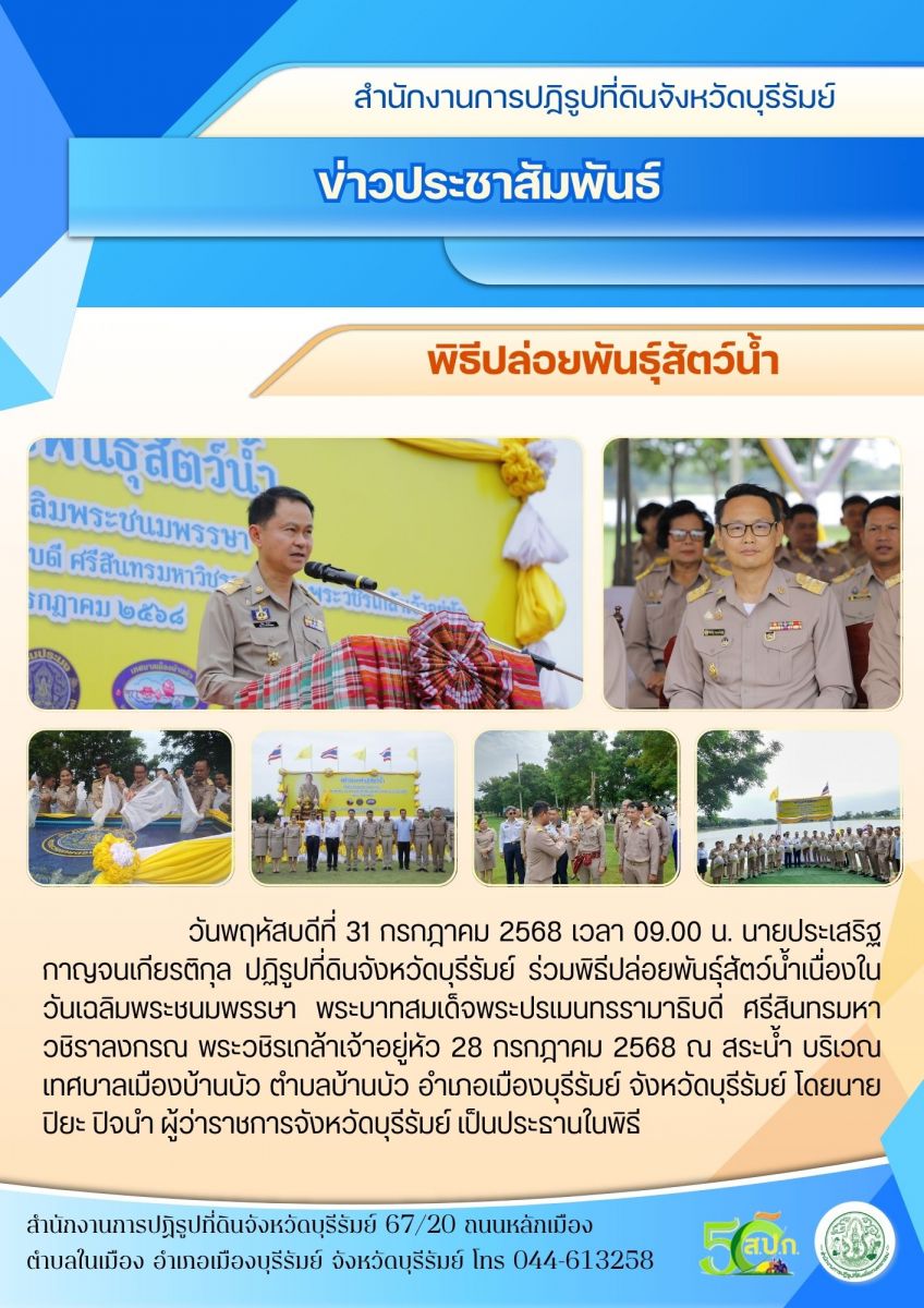 วันพฤหัสบดีที่ 31 กรกฎาคม 2568 เวลา 09.00 น. นายประเสริฐ กาญจนเกียรติกุล ปฏิรูปที่ดินจังหวัดบุรีรัมย์ ร่วมพิธีปล่อยพันธุ์สัตว์น้ำเนื่องในวันเฉลิมพระชนมพรรษา พระบาทสมเด็จพระปรเมนทรรามาธิบดี ศรีสินทรมหาวชิราลงกรณ พระวชิรเกล้าเจ้าอยู่หัว 28 กรกฎาคม 2568 ณ สระน้ำ บริเวณเทศบาลเมืองบ้านบัว ตำบลบ้านบัว อำเภอเมืองบุรีรัมย์ จังหวัดบุรีรัมย์ โดยนายปิยะ ปิจนำ ผู้ว่าราชการจังหวัดบุรีรัมย์ เป็นประธานในพิธี