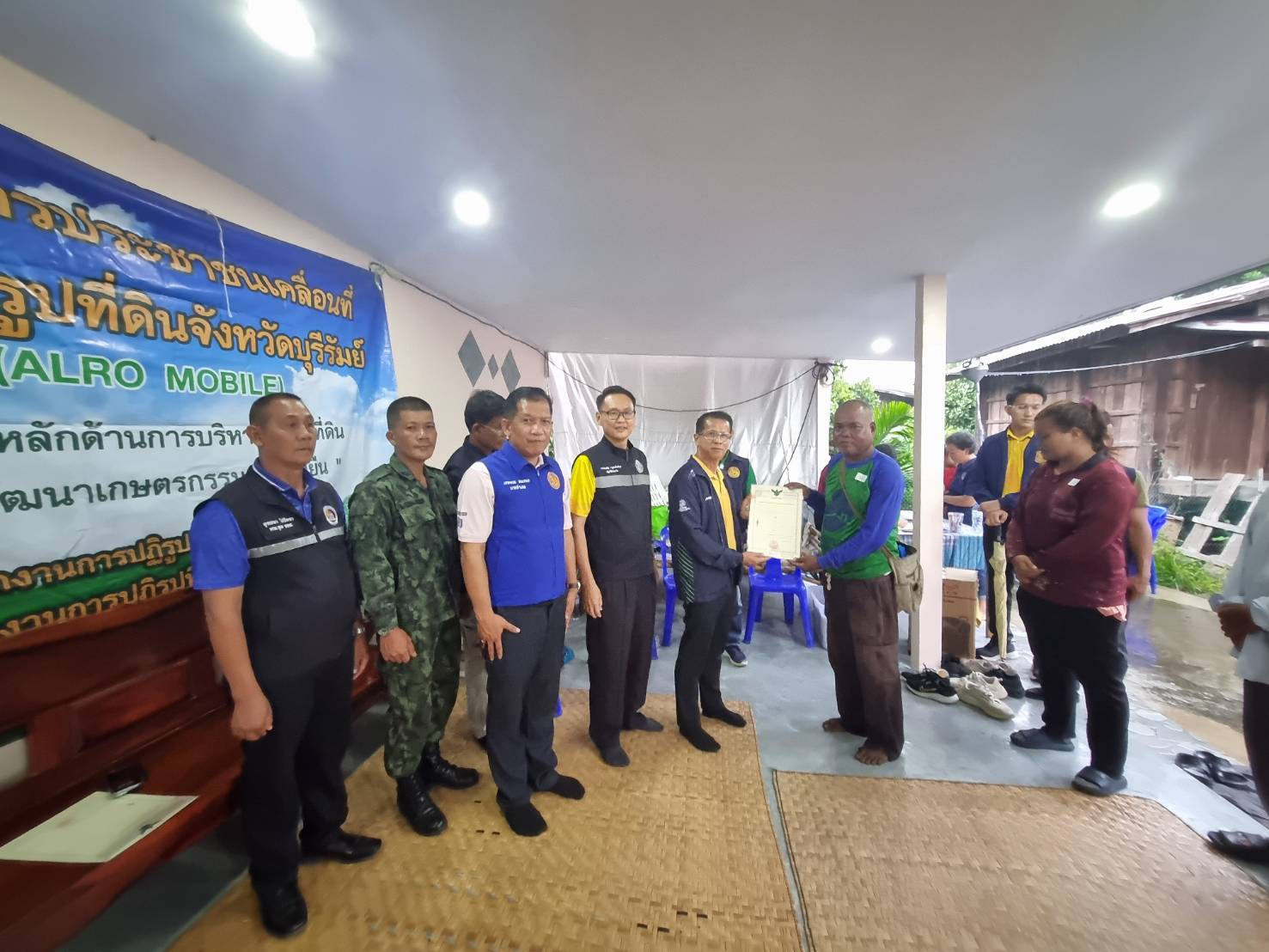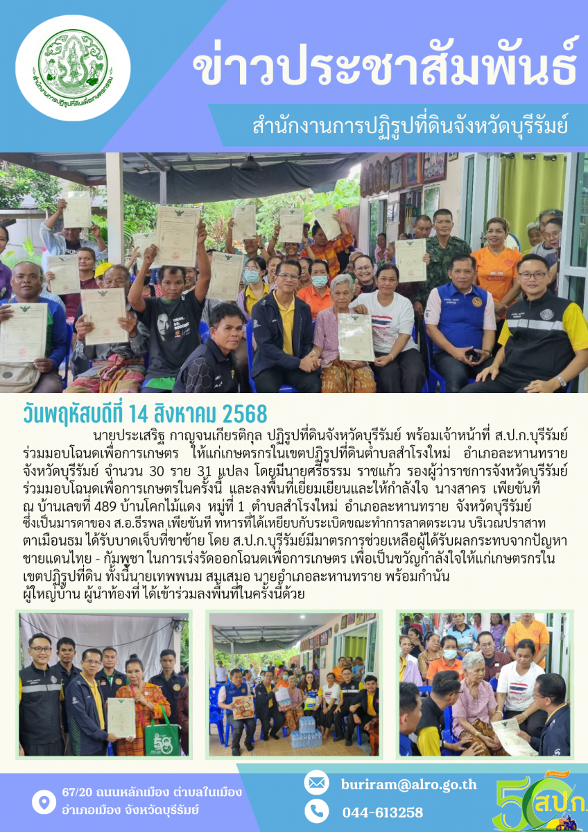 วันที่ 14 สิงหาคม 2568 ส.ป.ก.บุรีรัมย์ ร่วมกับจังหวัดบุรีรัมย์ และอำเภอละหานทรายเพื่อมอบโฉนดเพื่อการเกษตร และเยี่ยมเยียนให้กำลังใจ นางสาคร เพียขันที มารดา ส.อ.ธีรพล เพียขันที ทหารที่ได้รับบาดเจ็บขณะลาดตระเวณพื้นที่ชายแดน