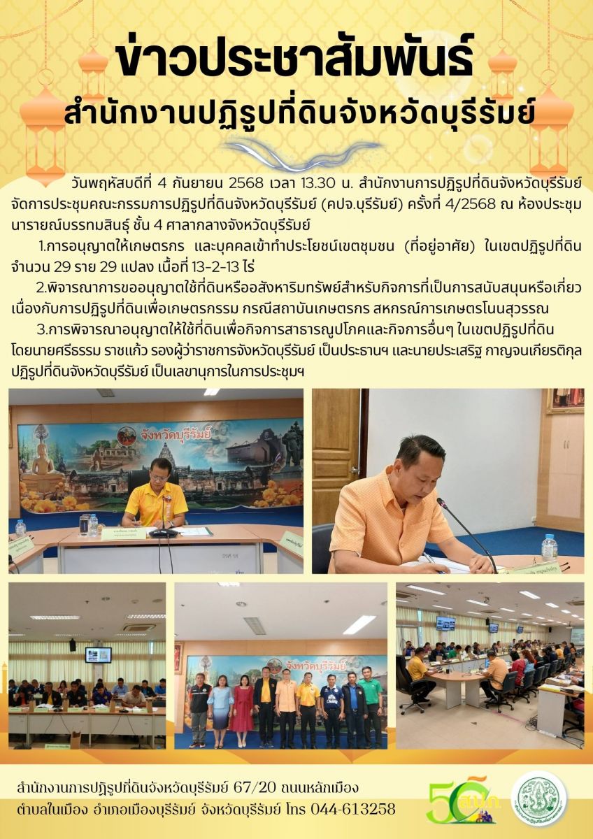 วันพฤหัสบดีที่ 4 กันยายน 2568 เวลา 13.30 น. ส.ป.ก.บุรีรัมย์ จัดการประชุมคณะกรรมการปฏิรูปที่ดินจังหวัดบุรีรัมย์ ครั้งที่ 4/2568