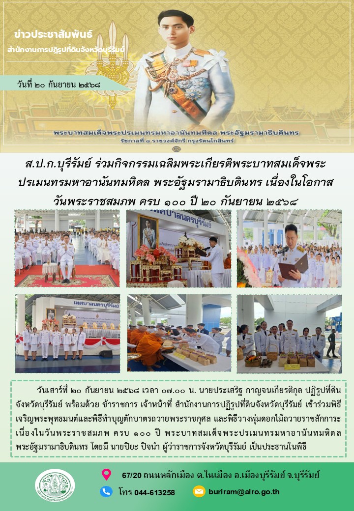 วันที่ 20 กันยายน 2568 นายประเสริฐ กาญจนเกียรติกุล ปฏิรูปที่ดินจังหวัดบุรีรัมย์ เข้าร่วมพิธีเจริญพระพุทธมนต์ พีธีทำบุญตักบาตรถวายพระราชกุศล และพิธีวางพานพุ่มดอกไม้ถวายราชสักการะเนื่องในวันพระราชสมภพ ครบ 100 ปี พระบาทสมเด็จพระปรเมนทรมหาอานันทมหิดล พระอัฐมรามาธิบดินทร
