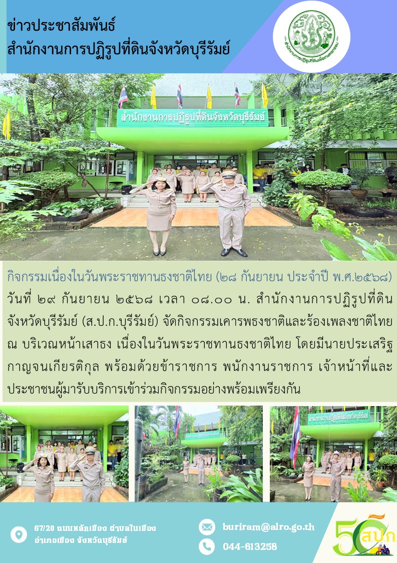 วันที่ 29 กันยายน 2568 เวลา 08.00 น. ส.ป.ก.บุรีรัมย์ จัดกิจกรรมเคารพธงชาติและร้องเพลงชาติไทย เนื่องในวันพระราชทานธงชาติไทย