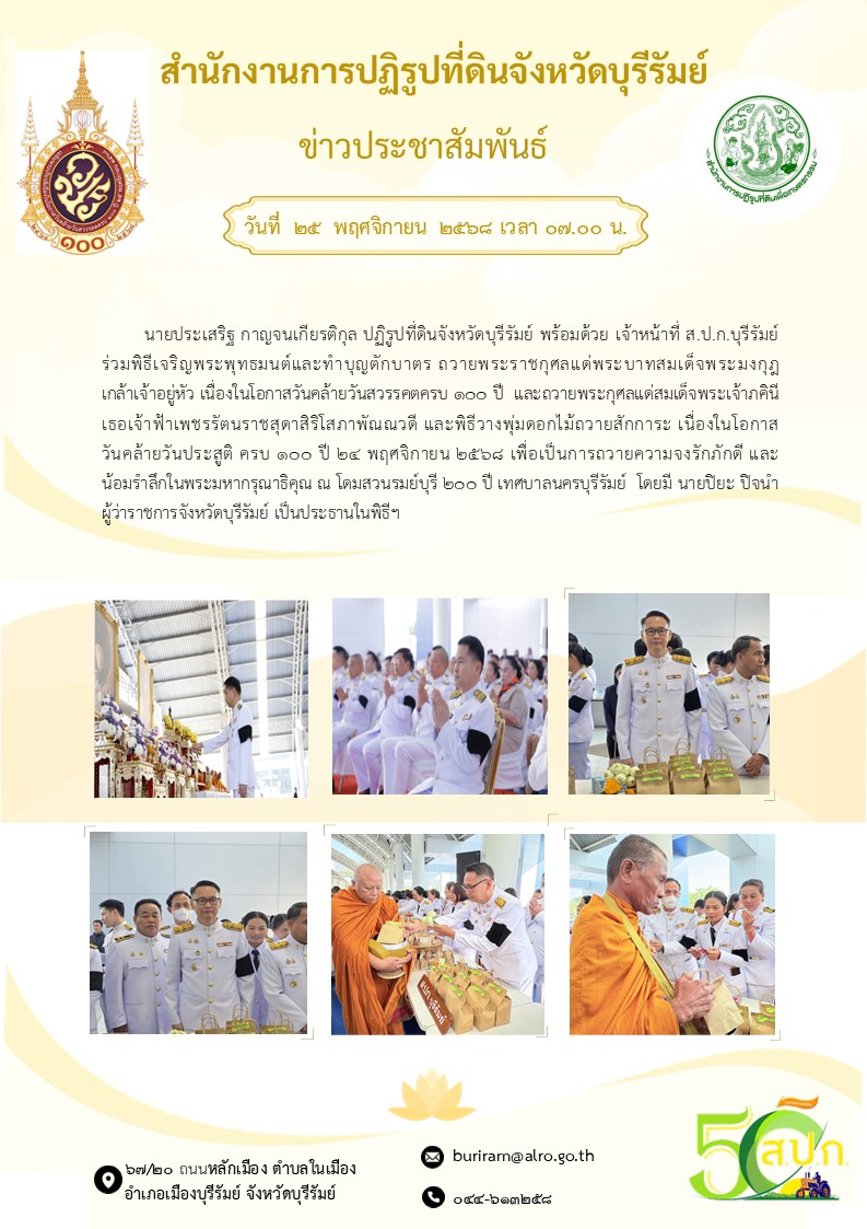 วันที่ 25 พฤศจิกายน 2568 เวลา 07.00 น. นายประเสริฐ กาญจนเกียรติกุล ปฏิรูปที่ดินจังหวัดบุรีรัมย์ ปฏิรูปที่ดินจังหวัดบุรีรัมย์ พร้อมด้วย เจ้าหน้าที่ ส.ป.ก.บุรีรัมย์ ร่วมพิธีเจริญพระพุทธมนต์และทำบุญตักบาตร ถวายพระราชกุศลแด่พระบาทสมเด็จพระมงกุฎเกล้าเจ้าอยู่หัวเนื่องในโอกาสวันคล้ายวันสวรรคตครบ๑๐๐ ปี
