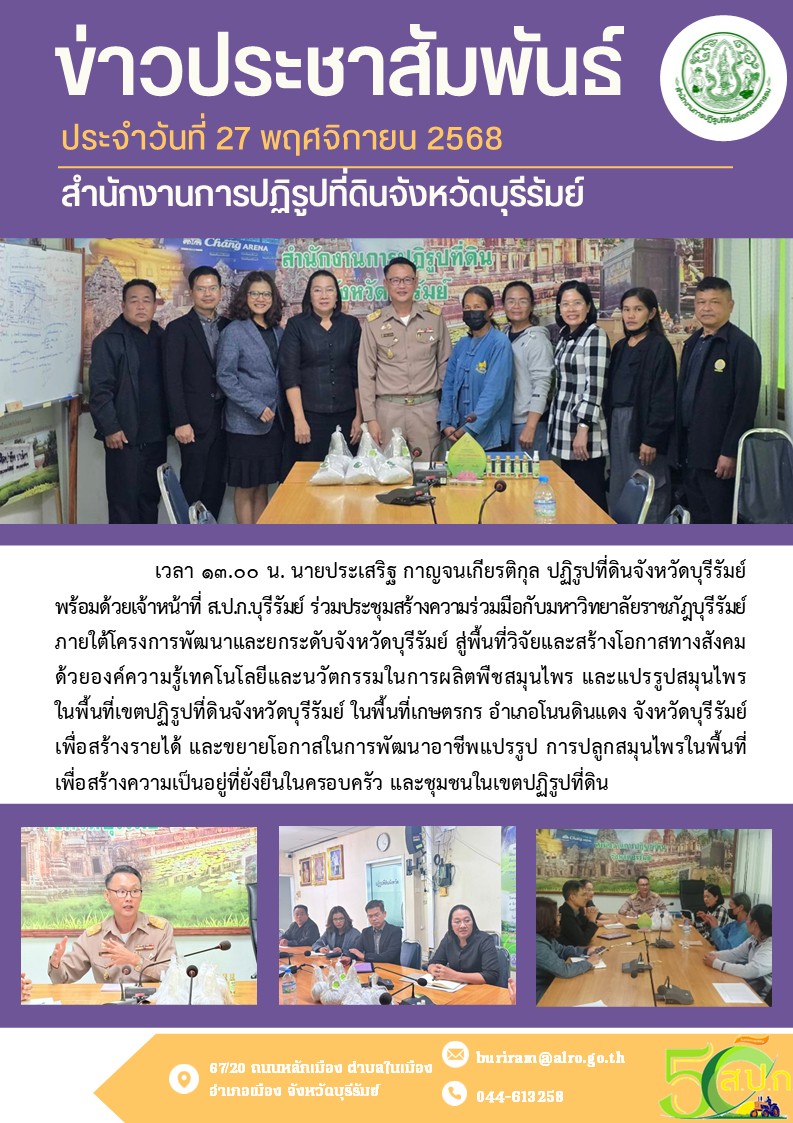 วันที่ 27 พฤศจิกายน 2568 เวลา 13.00 น. นายประเสริฐ กาญจนเกียรติกุล ปฏิรูปที่ดินจังหวัดบุรีรัมย์ ร่วมประชุมสร้างความร่วมมือกับมหาวิทยาลัยราชภัฏบุรีรัมย์ ภายใต้โครงการพัฒนาและยกระดับจังหวัดบุรีรัมย์ สู่พื้นที่วิจัยและสร้างโอกาสทางสังคมด้วยองค์ความรู้เทคโนโลยีและนวัตกรรมในการผลิตพืชสมุนไพร และการแปรรูปสมุนไพร ในพื้นที่เขตปฏิรูปที่ดินจังหวัดบุรีรัมย์