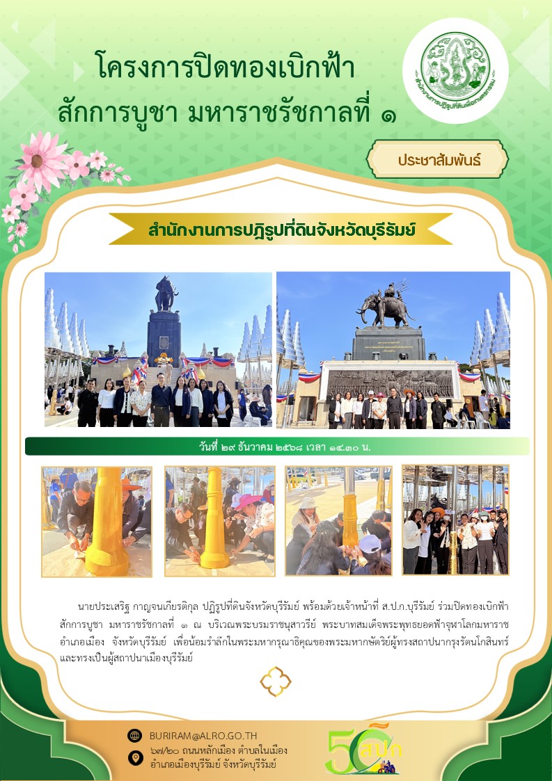 วันที่ 29 ธันวาคม 2568 เวลา 14.30 น. นายประเสริฐ กาญจนเกียรติกุล ปฏิรูปที่ดินจังหวัดบุรีรัมย์ พร้อมเจ้าหน้าที่ ส.ป.ก.บุรีรัมย์ ร่วมโครงการปิดทองเบิกฟ้า สักการบูชามหาราชรัชกาลที่ 1